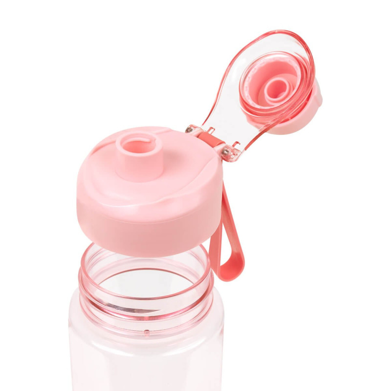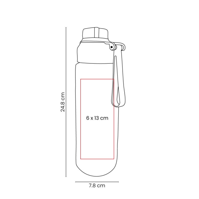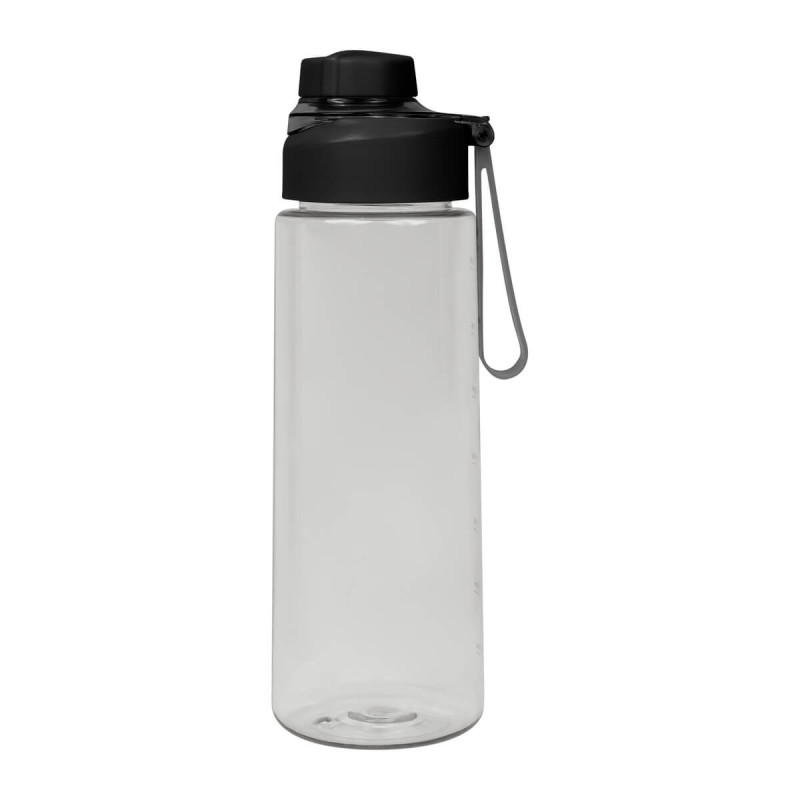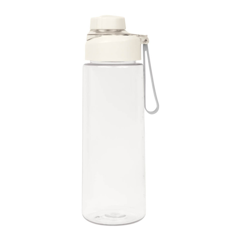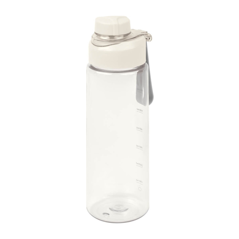 Cilindro de plastico de una pared. Tapa de plastico con sistema de rosca y sobretapa para la boquilla. Cuenta con asa de silicon para llevarlo comodamente e indicador de mililitros. Perfecto para el dia a dia.