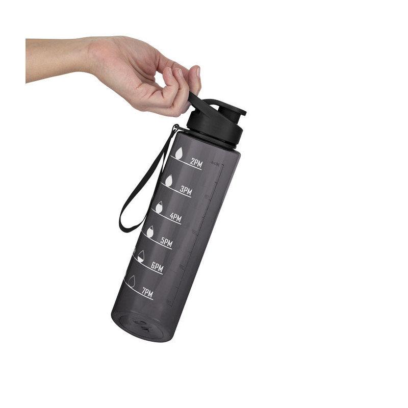 Botella con marcador de tiempo y medida. Color translúcido con tapa plástica flip top con asa, boquilla y correa del mismo color de la botella.