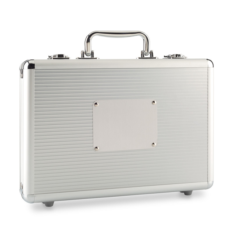 Set de póker en caja de aluminio. Incluye dos naipes de cartas, 5 dados, 200 fichas en cuatro colores y 1 ficha de dealer. Empaque caja individual.