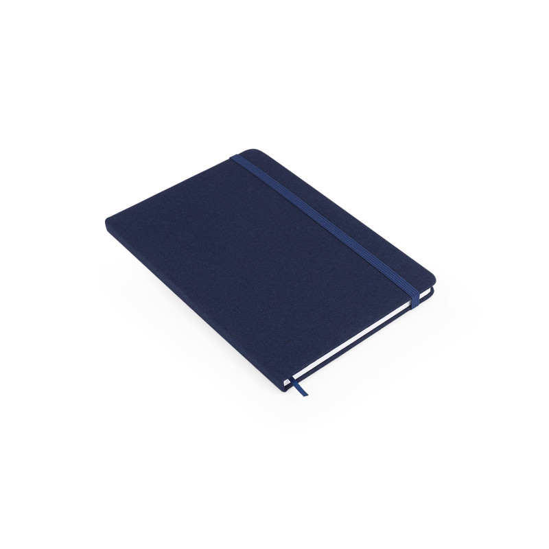 Libreta con cubierta dura forrada en algodón. Con banda elástica de cierre. Contiene 80 hojas rayadas. El tamaño aproximado de la hoja: A5.