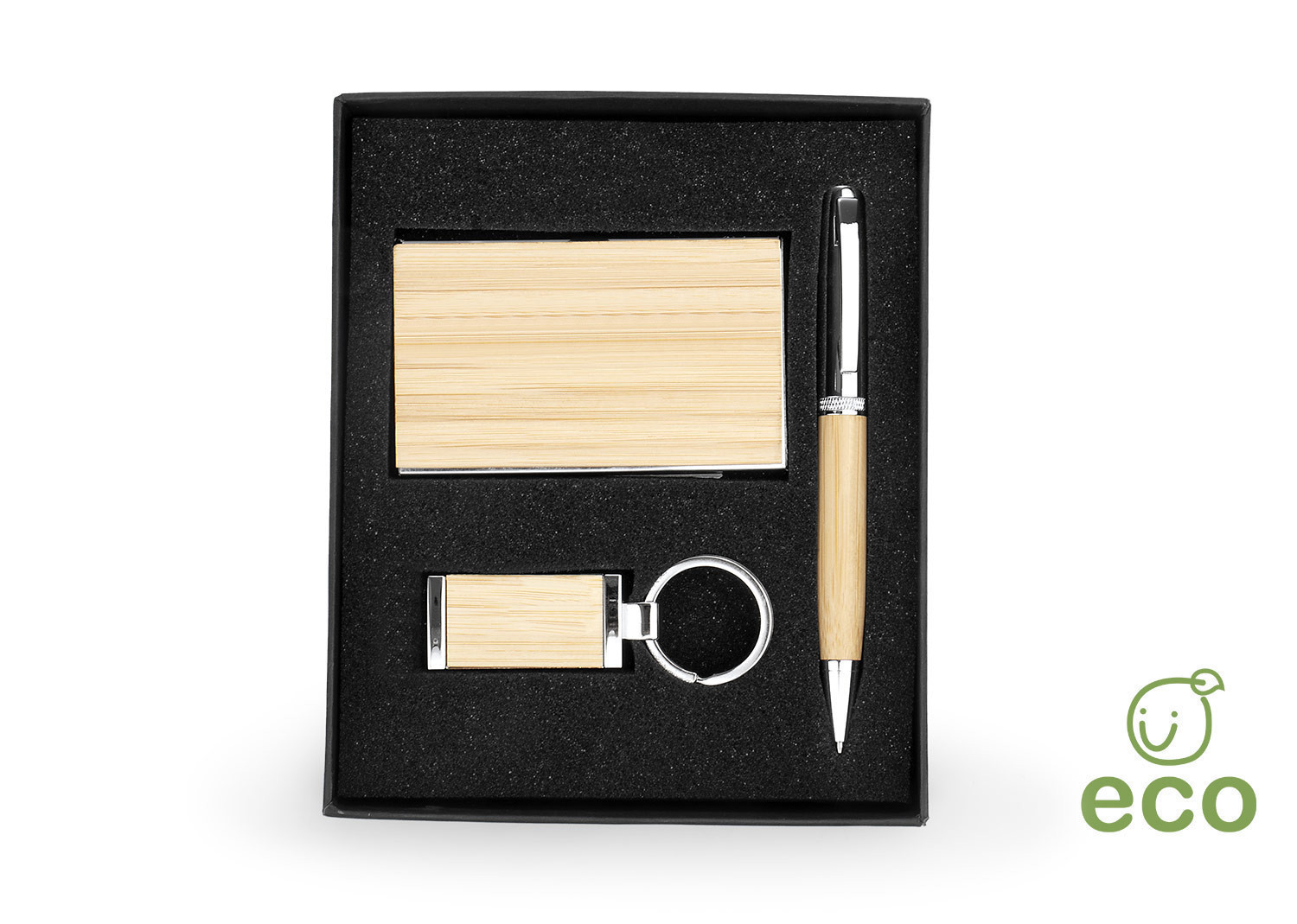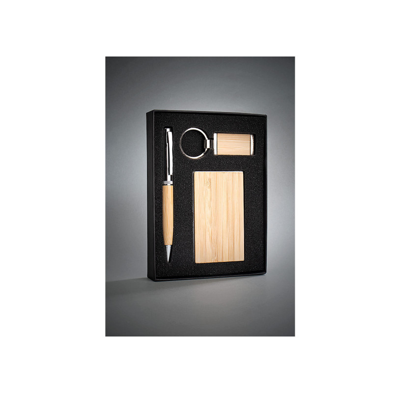 Set ejecutivo, incluye porta tarjetas metalico, llavero metalico rectangular y bolígrafo en Aluminio con sistema twist, todos con acabados en Bambú para la marca en laser, caja de regalo negra