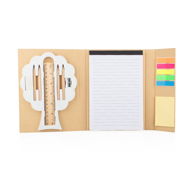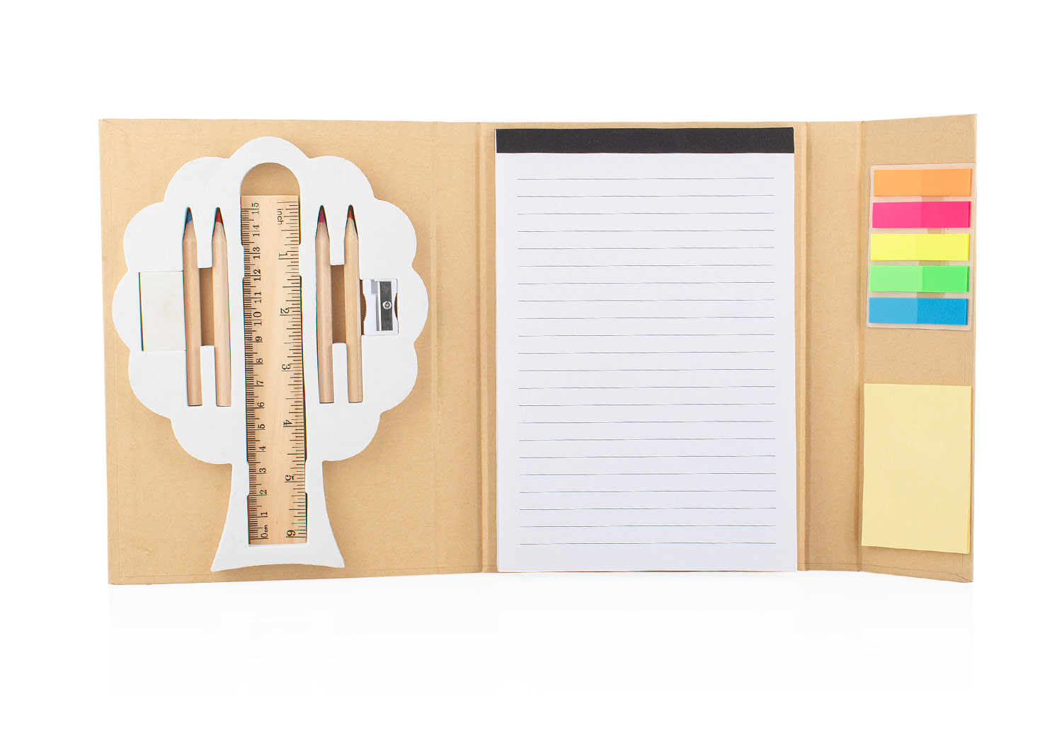 Práctica libreta con accesorios integrados, ideal para uso escolar o de oficina. Incluye: 4 colores (8,8 X Ø 0,5), 1 regla (15 cm) y (6"), 1 sacapuntas, borrador, 50 hojas de papel de 70 g/m² (13,6 X 20,4), 25 hojas de notas adhesivas (5 X 7,5) y separadores adhesivos en 5 colores. Cierre con caucho para mantener el contenido seguro. Diseño compacto y funcional para mantener todo lo esencial en un solo lugar.