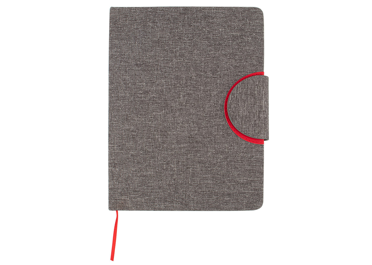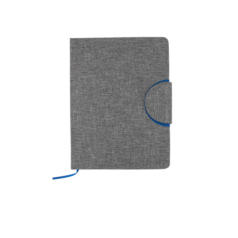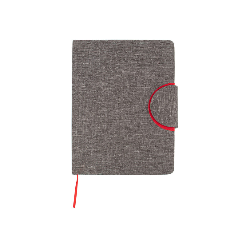 Libreta ecológica con tapa dura en PU de color combinado con tela RPET, que ofrece un diseño moderno y sostenible. La contraportada está fabricada en tela RPET y cuenta con una hebilla magnética que mantiene la libreta cerrada de forma segura. En su interior, incluye 80 hojas de papel rayado de 70 g/m² e incorpora una cinta marcadora para facilitar la organización.