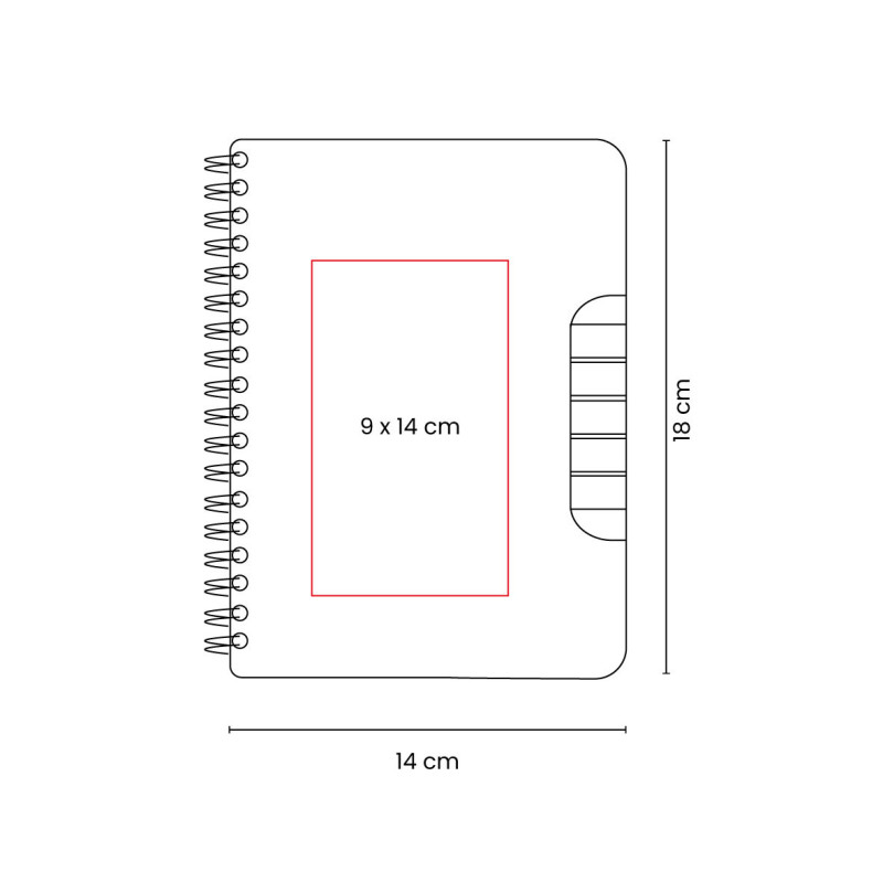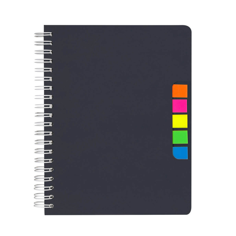 Libreta con 70 hojas de raya. Incluye banderillas adheribles de diferentes colores, bolígrafo ecológico y espiral metálico doble.