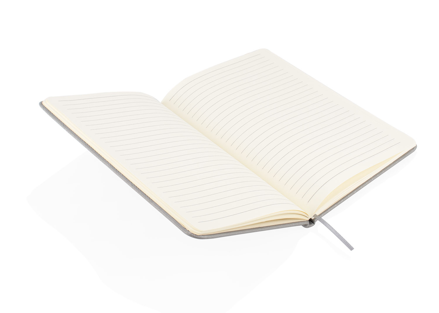 Libreta de diseño profesional con cubierta frontal en PU térmico grabado con rayas diagonales y cubierta trasera en PU termo, que le otorgan un acabado elegante y resistente. Contiene 80 hojas interiores de papel rayado de 70 g/m², ideales para escritura diaria. Además, incluye una cinta marcadora y una banda elástica para mantenerla cerrada de forma segura.