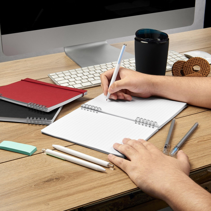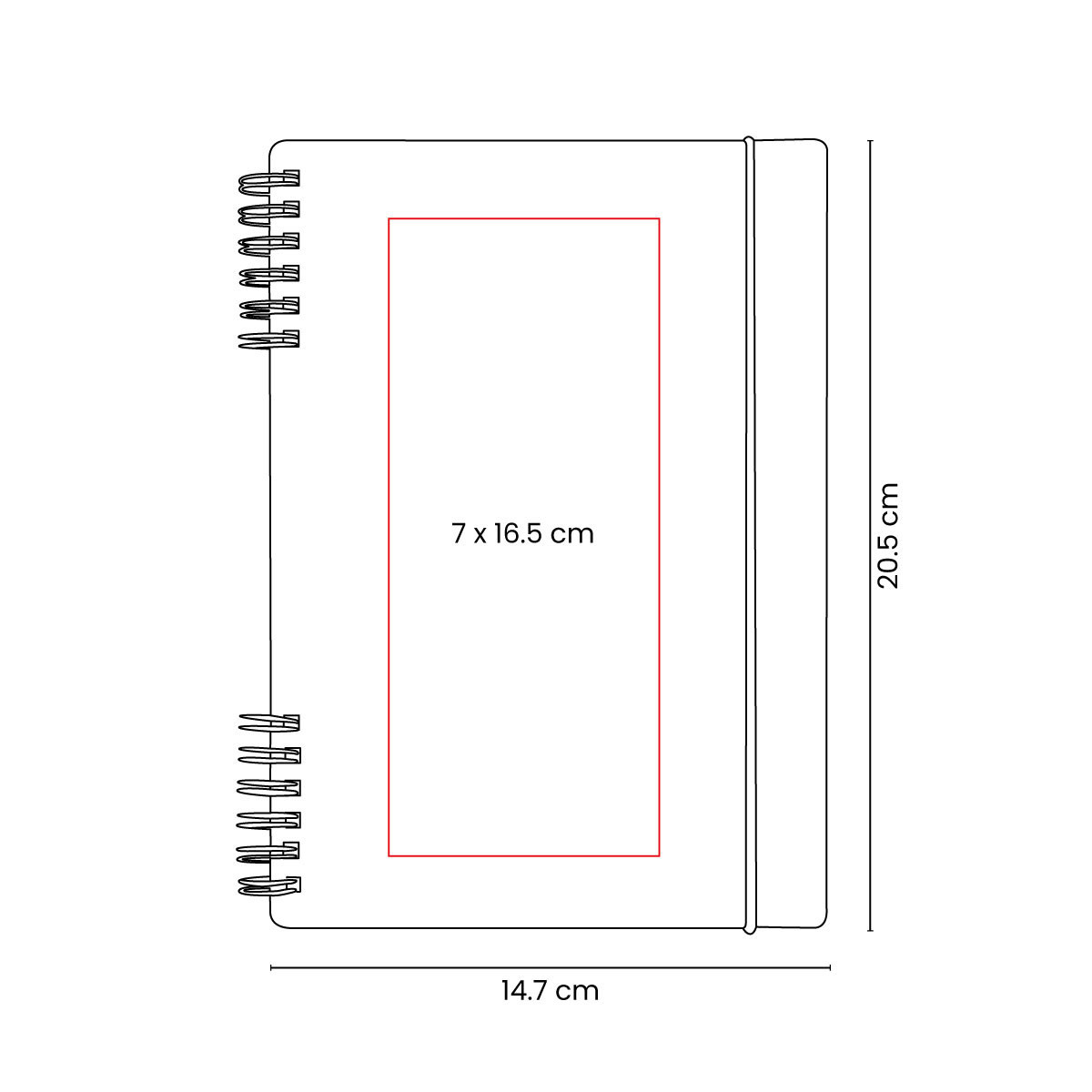 Libreta ecológica con 70 hojas a rayas. Cubierta de cartón. Incluye espiral metalico y elástico para cerrar. Su diseño divide el espiral aportando un toque distintivo de las libretas convencionales. La pasión por el medio ambiente, haz una elección sostenible y creativa al mismo tiempo.