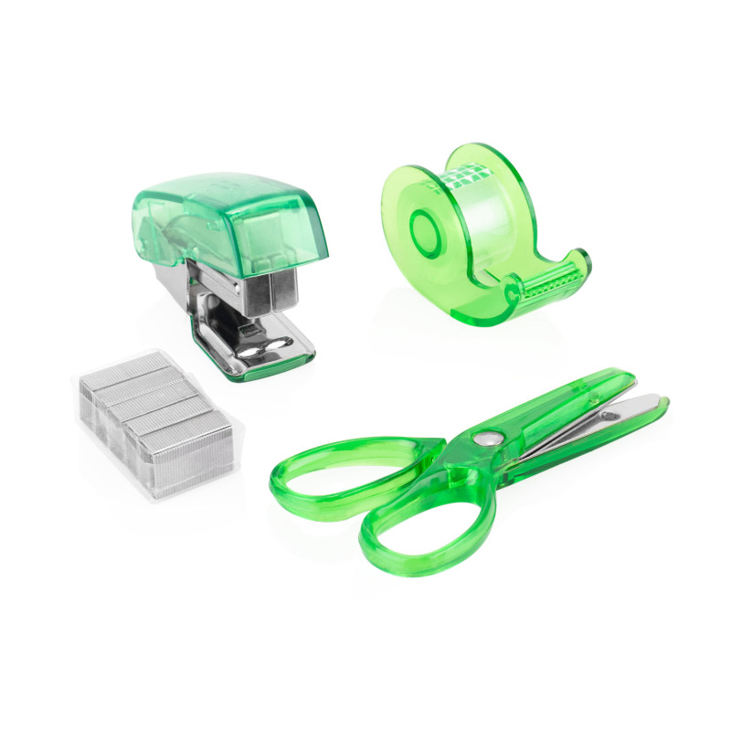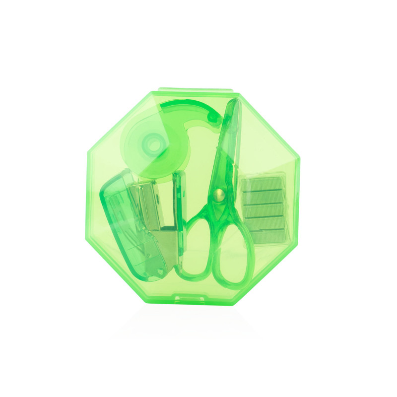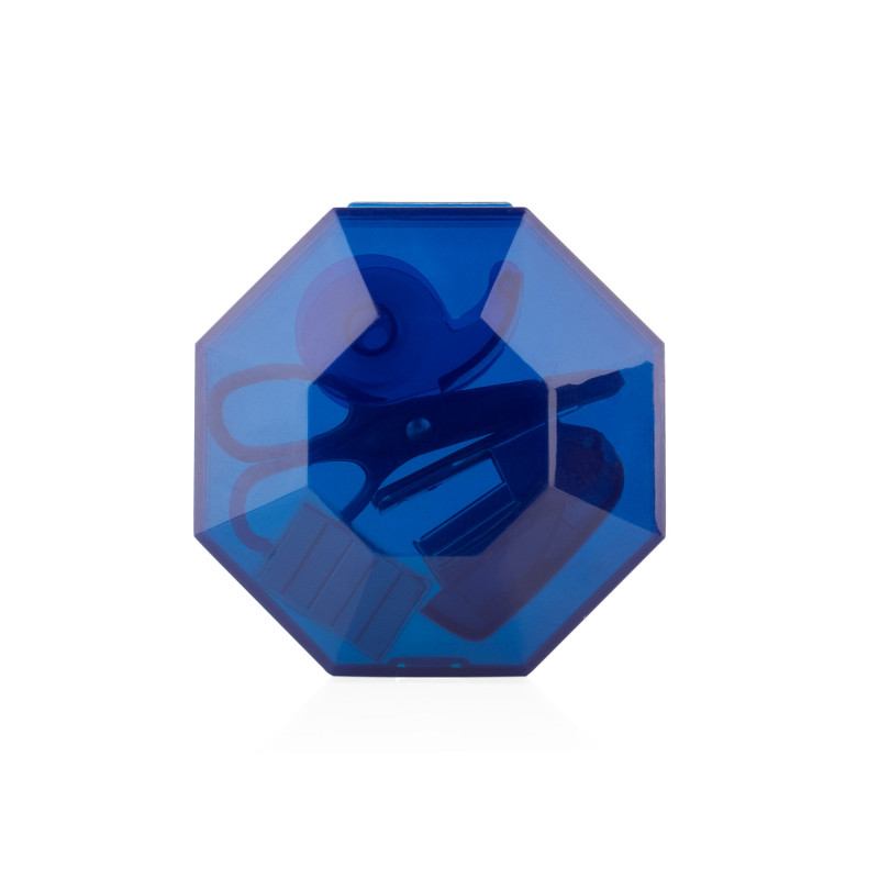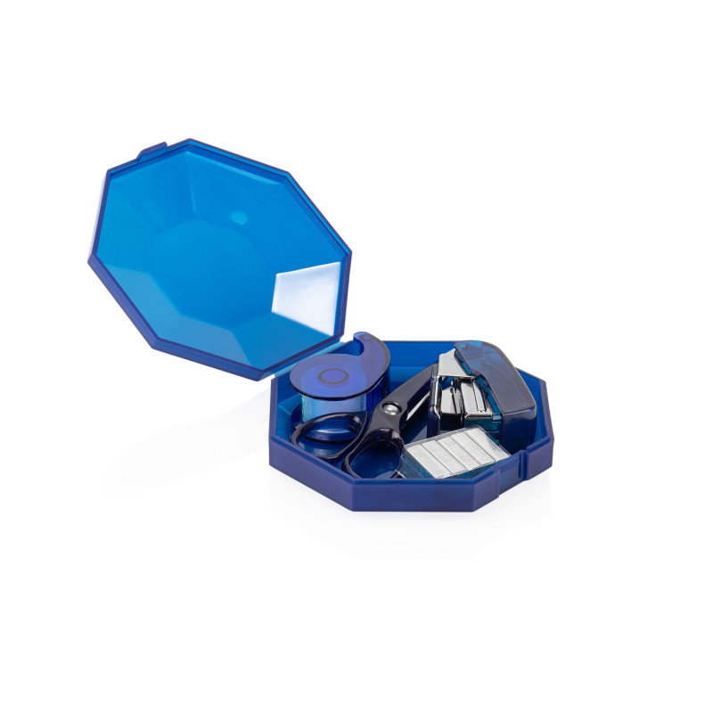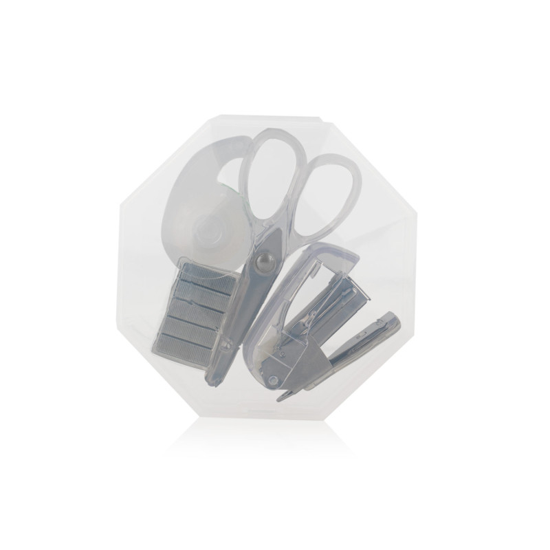Práctico set de oficina con diseño octogonal y cierre a presión, ideal para mantener organizados los elementos esenciales de escritorio. El estuche incluye ganchos para cosedora, una cosedora (4 X 2,8 X 1,7), tijeras (3,4 X 7,2 X 0,6) y cinta adhesiva transparente con dispensador (3,7 X 2,3 X 1,4).