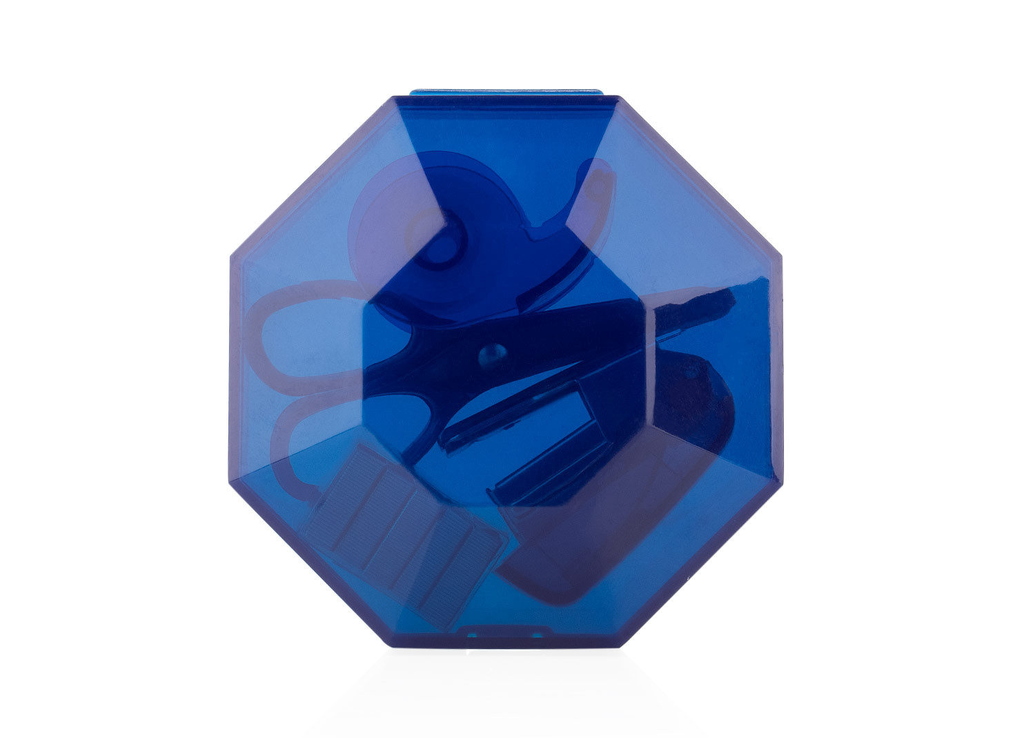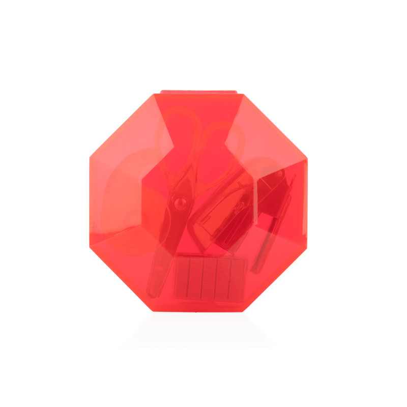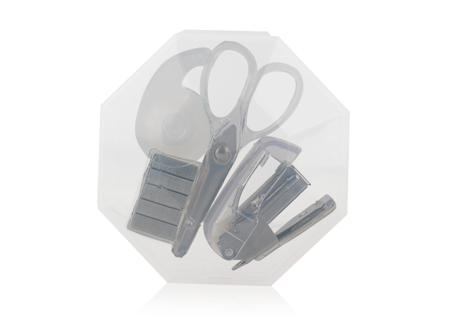 Práctico set de oficina con diseño octogonal y cierre a presión, ideal para mantener organizados los elementos esenciales de escritorio. El estuche incluye ganchos para cosedora, una cosedora (4 X 2,8 X 1,7), tijeras (3,4 X 7,2 X 0,6) y cinta adhesiva transparente con dispensador (3,7 X 2,3 X 1,4).