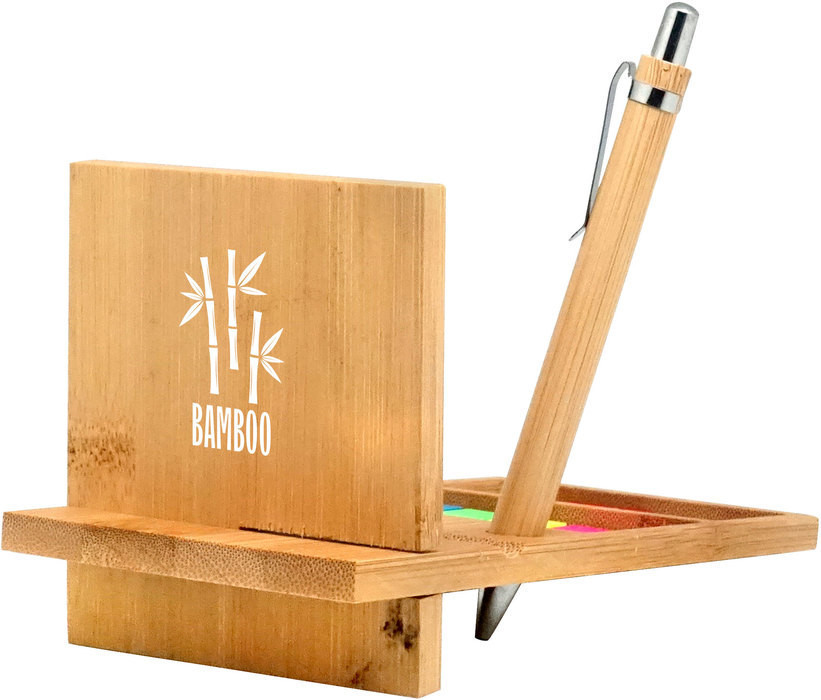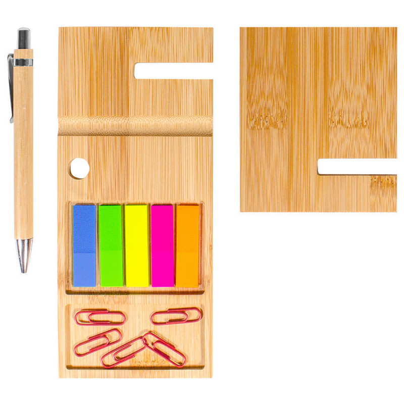 Organizador de escritorio compuesto por dos piezas engranables con compartimentos para accesorios y ranuras porta boligrafo y porta celular. Parte posterior también funciona como soporte porta celular. Incluye bolígrafo (cuerpo de bambú, pulsador, clip y detalles metálicos, tinta negra), set de 5 señaladores autoadhesivos de diferentes colores y clips en color rojo. Ideal para acompañar tus tareas tanto en la oficina como home office. PRESENTADO EN CAJA DE REGALO.