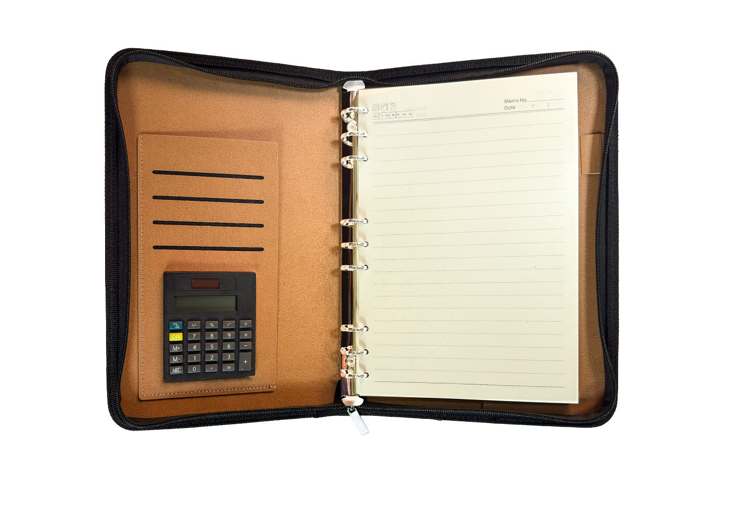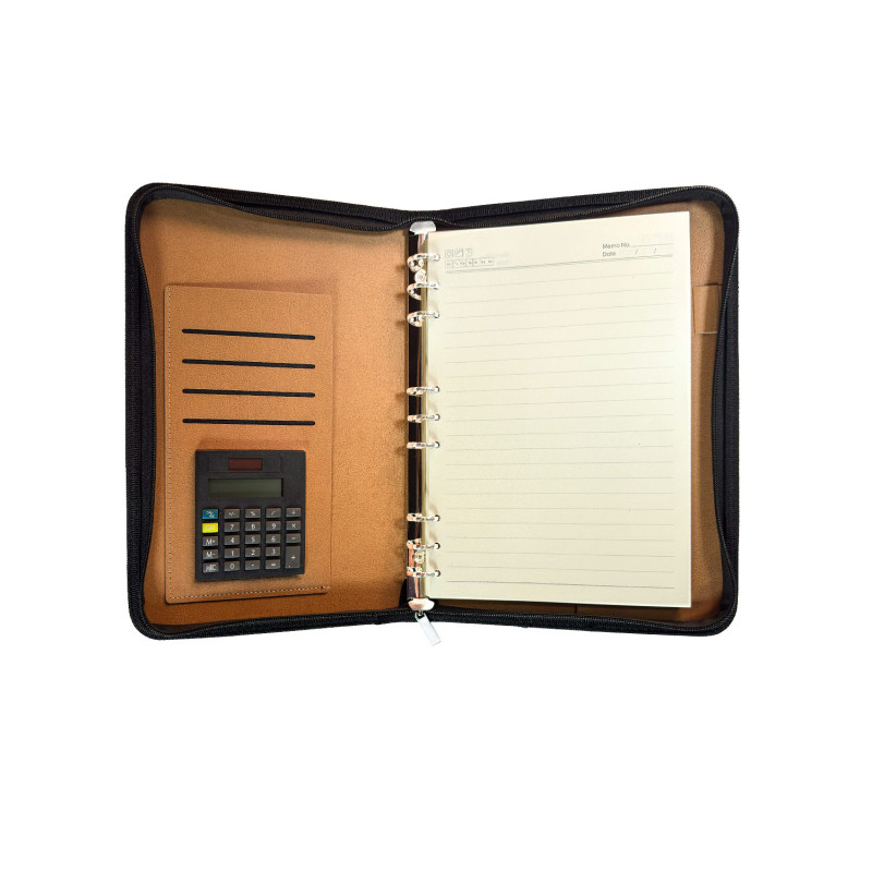 Organización y funcionalidad en un solo diseño. Esta libreta cuenta con: cubierta y contraportada en PU resistente, 100 hojas interiores de 80 g/m² con impresión de líneas (14,2 X 20,8), carpeta interna (12 X 19), bolsillos para tarjetas y documentos, inserto para bolígrafo, calculadora integrada, correa de cierre para mantener el contenido seguro. Ideal para reuniones, trabajo o estudio, combina estilo profesional con practicidad.