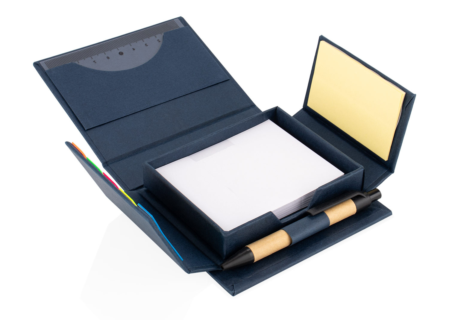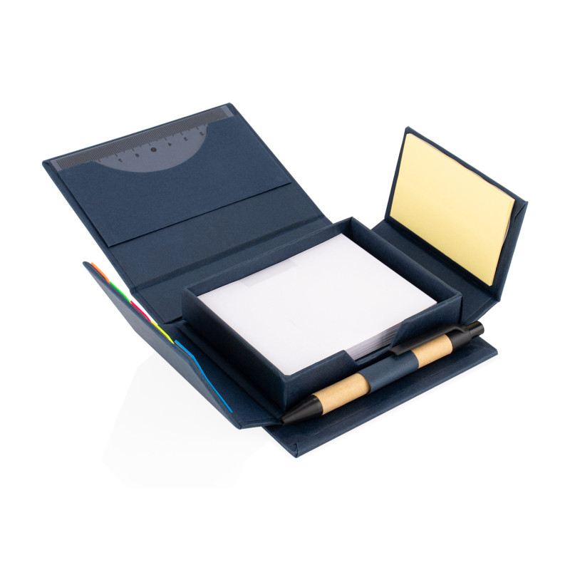 Set de escritorio presentado en elegante estuche rígido. Incluye regla de PP (10 - 4"), mini nota adhesiva (5 X 10), notas adhesivas amarillas de 15 hojas, bloc de notas blanco de 100 hojas y bolígrafo retráctil de papel. Un conjunto práctico y organizado para el día a día.