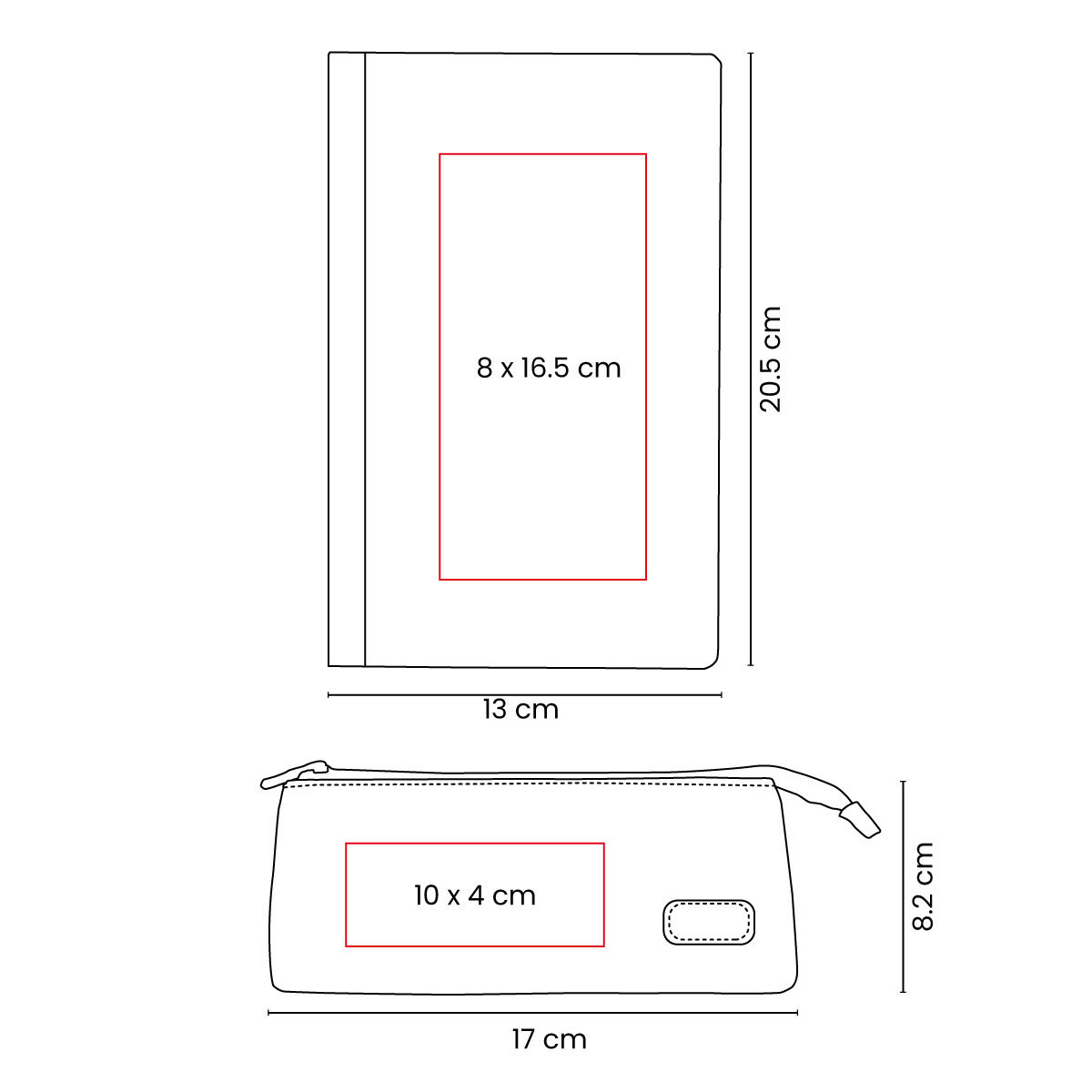 Área de impresión: 8 x 16.5 cm (libreta) / 10 x 4 cm (estuche)