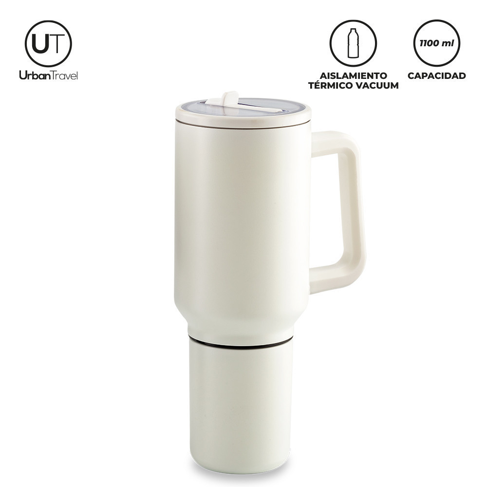 Mug doble pared vacuum en acero inoxidable, con aislamiento térmico que mantiene la bebida fría o caliente hasta 6h aprox (puede variar dependiendo de las condiciones climáticas). Con tapa rosca y pitillo. Dos compartimientos, uno funciona como mug con capacidad para 600 ml y el otro funciona como vaso con capacidad para 500ml. Empaque caja individual.