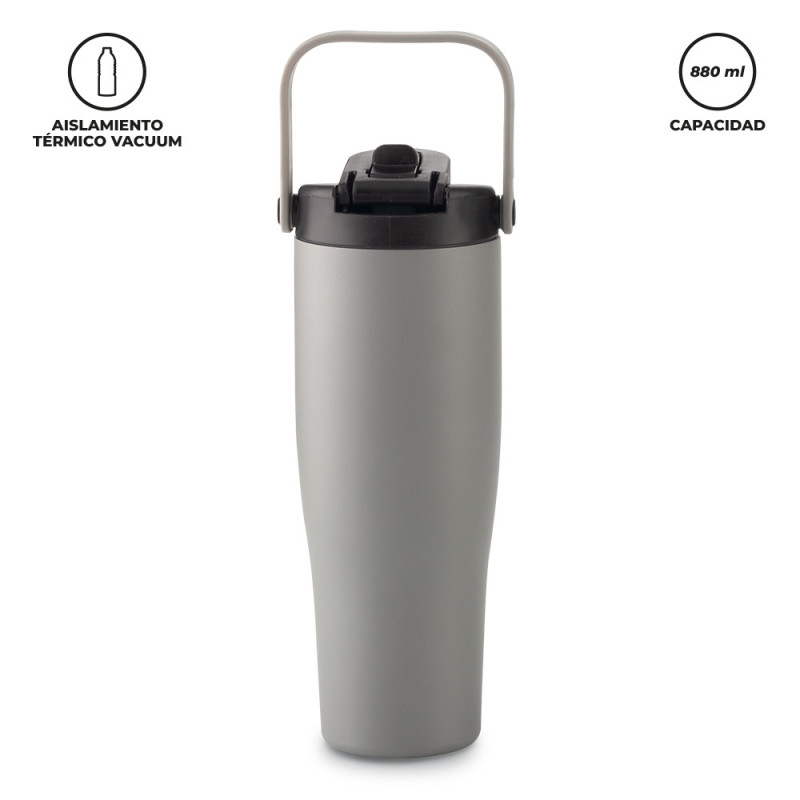 Mug metálico doble pared vacuum en acero inoxidable, con aislamiento térmico que mantiene la bebida fría entre 8-10h aprox o caliente 3-4h aprox (puede variar dependiendo las condiciones climáticas). Tapa rosca plástica con pitillo y chupo. Manija para cargarlo. Empaque caja individual.