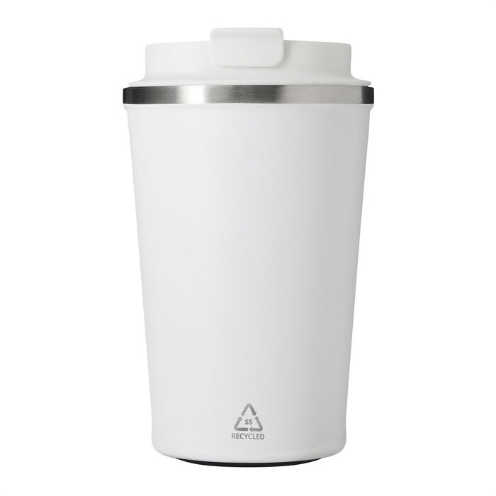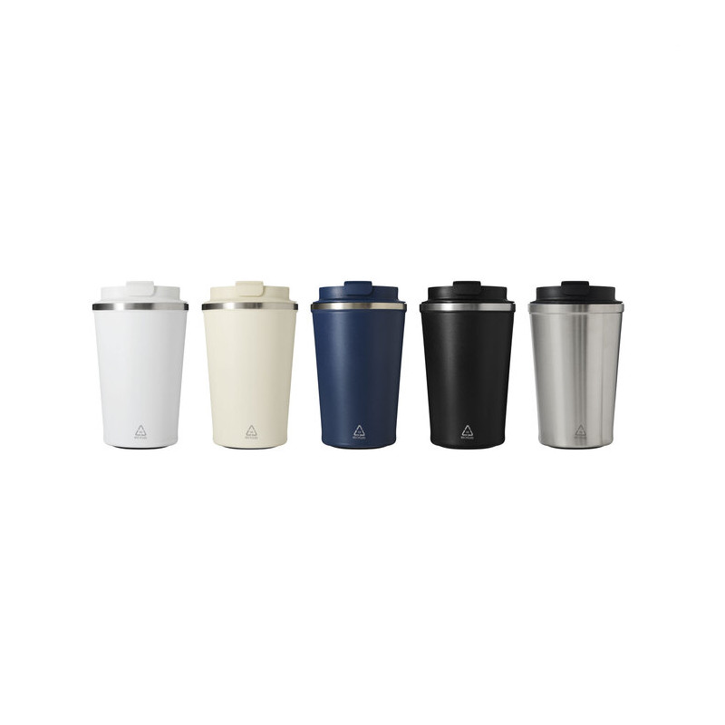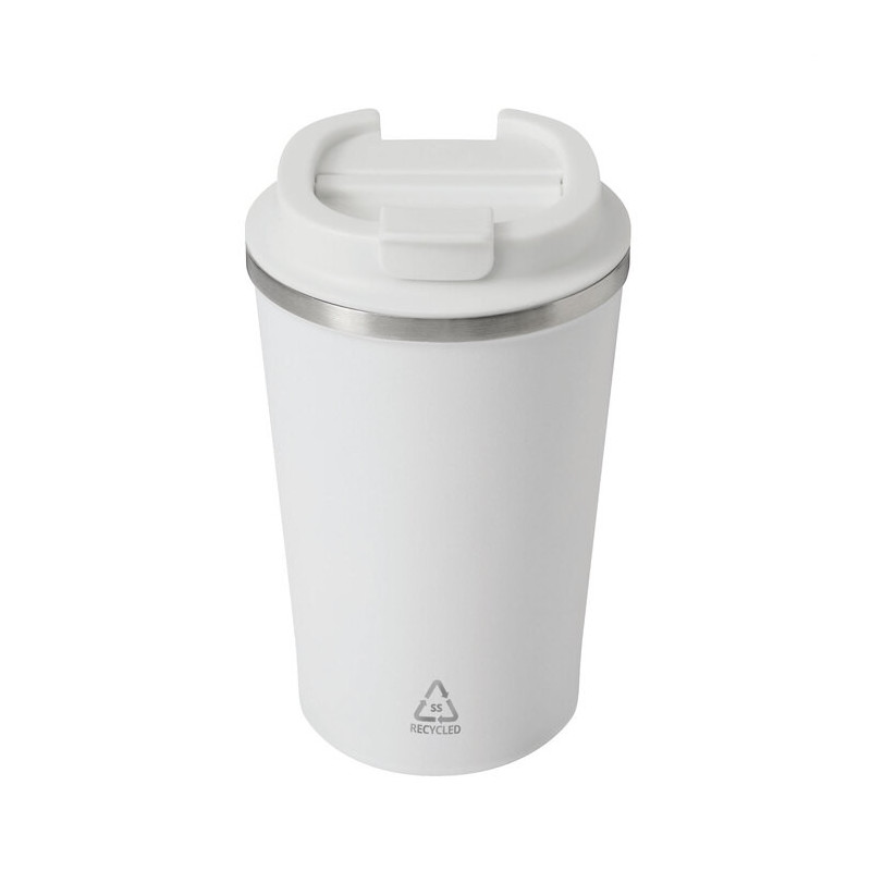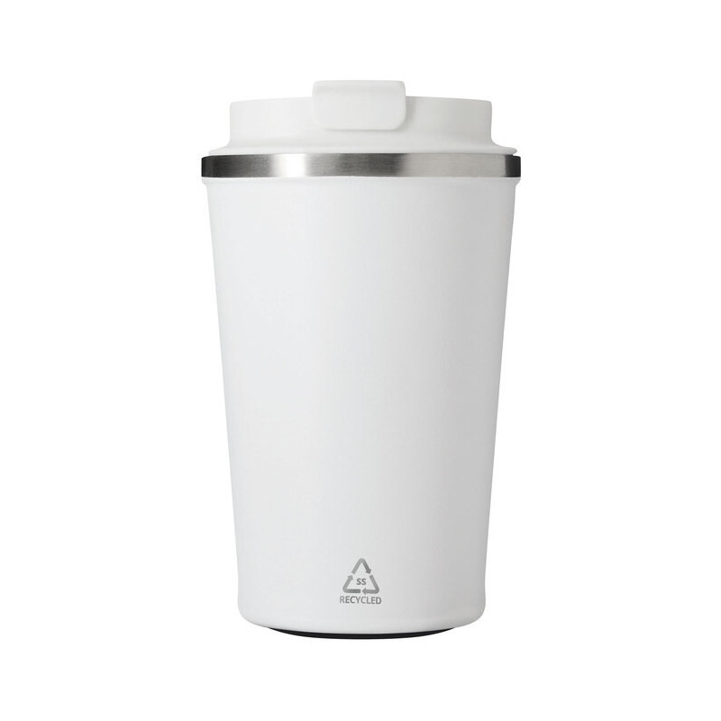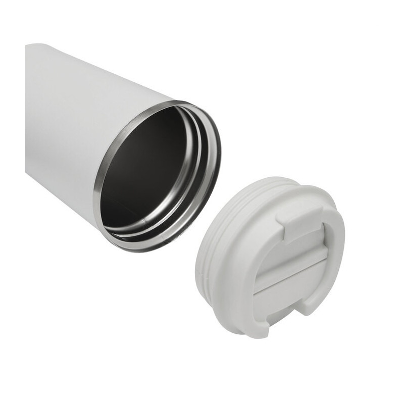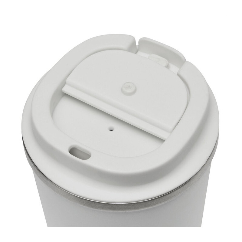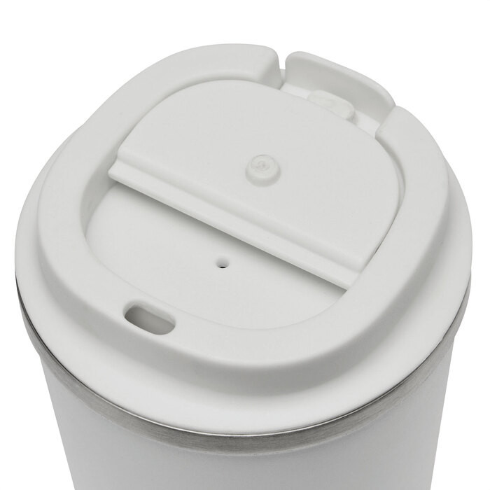 Mug doble pared, sellado al vacío. Aislamiento térmico. Tecnología vacuum. Interior en acero 304 reciclado y exterior en acero 201 reciclado. Tapa de polipropileno a rosca, del mismo color que el vaso, con anillo de silicona y seguro antiderrame. Pintura con acabado mate, textura porosa. Base de silicona antideslizante. Mantiene hasta 8 hs la temperatura de las bebidas calientes y 12 hs de las bebidas frías.