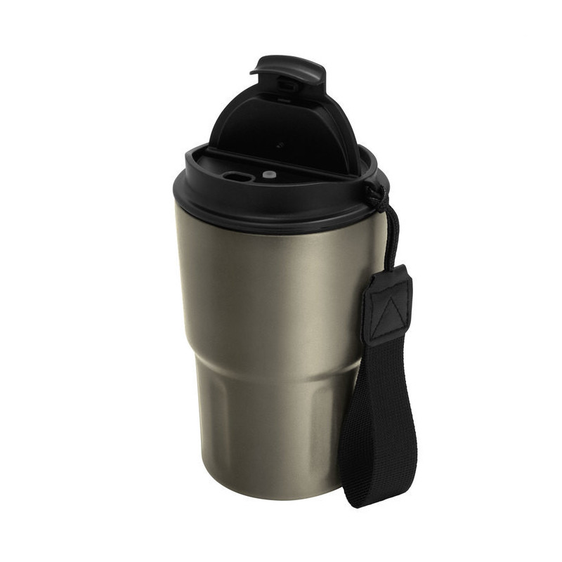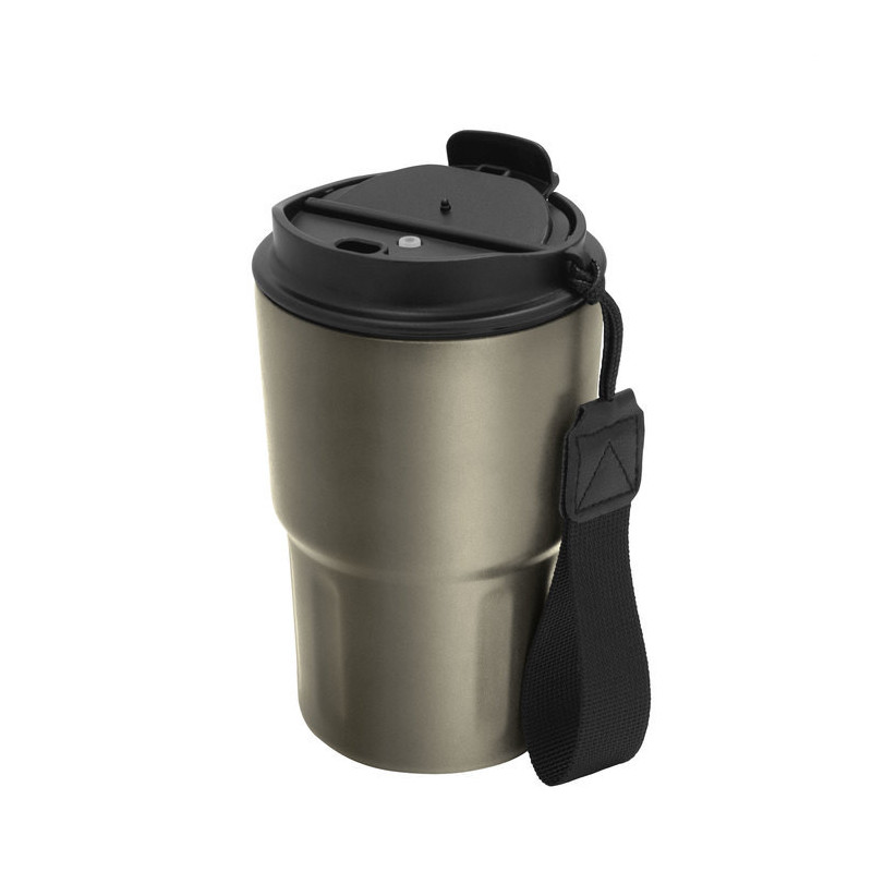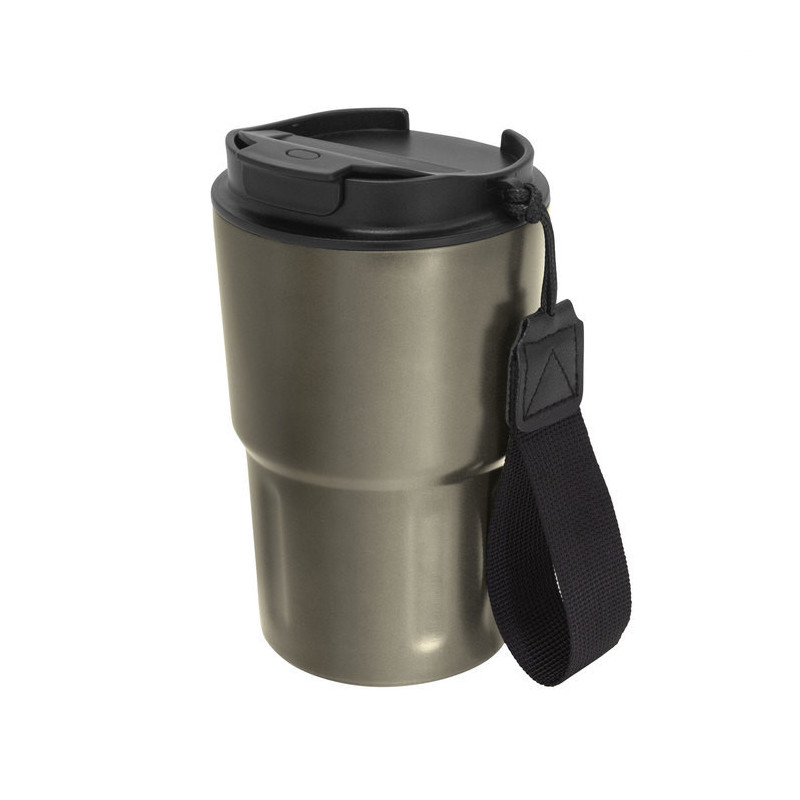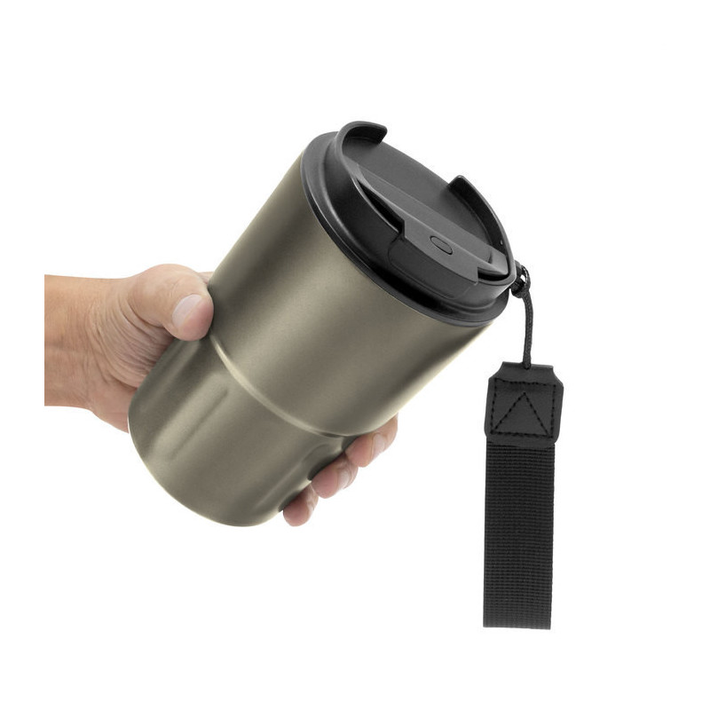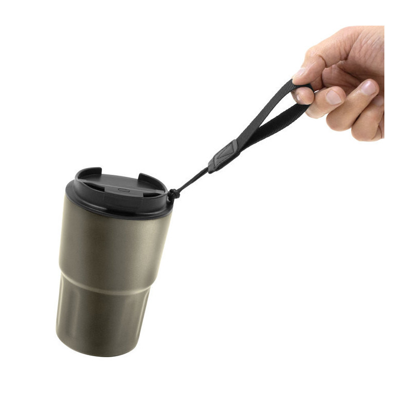 Mug doble pared, sellado al vacío. Mug con aislamiento térmico. Tecnología vacuum. Interior en acero 304 y exterior en acero 201. Tapa de polipropileno con anillo de silicona y correa de poliéster en color negro. Pintura acabado mate. Mantiene por más de 12 hs la temperatura de las bebidas calientes y 24 hs de las bebidas frías.