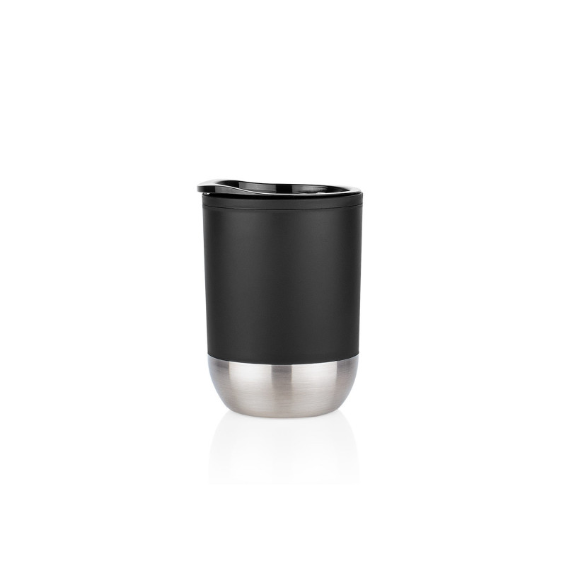 Vaso plástico para café. Resistente, con recubrimiento inferior de metal. Tapa con boquilla para deslizar con caucho en la rosca para evitar derrames. Capacidad 300ml/10 Oz