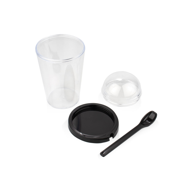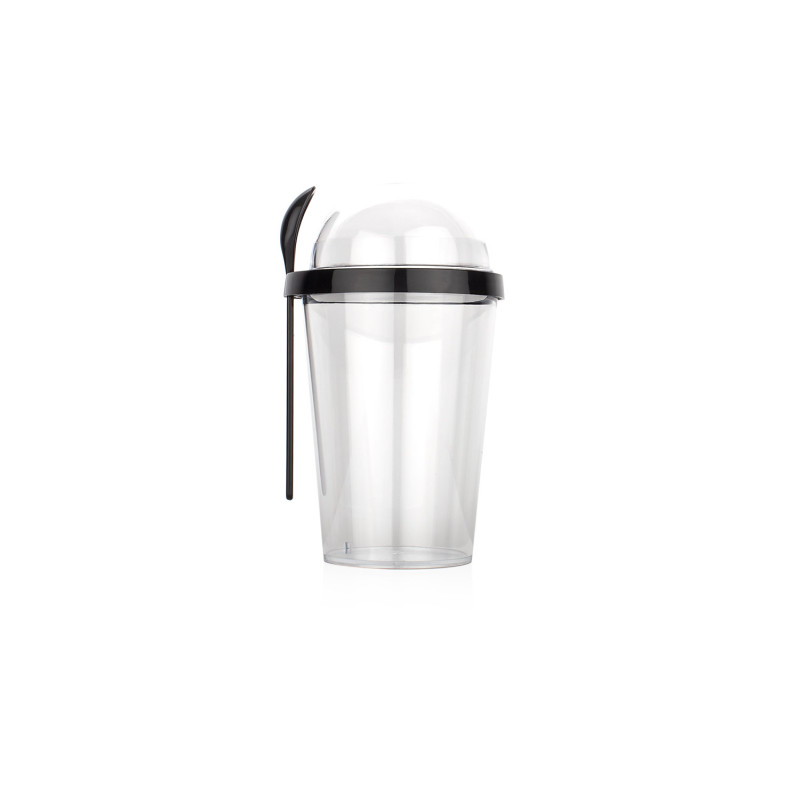 Contenedor plástico con tapa y compartimiento superior de cierre giratorio. Diseñado para ofrecer practicidad y organización, cuenta con una cuchara integrada (2,1 X 13,2) que facilita el consumo directo. Su sistema de cierre giratorio asegura un almacenamiento hermético, ideal para transportar alimentos secos o snacks de forma segura. Capacidad: 450 ml / 15 Oz.