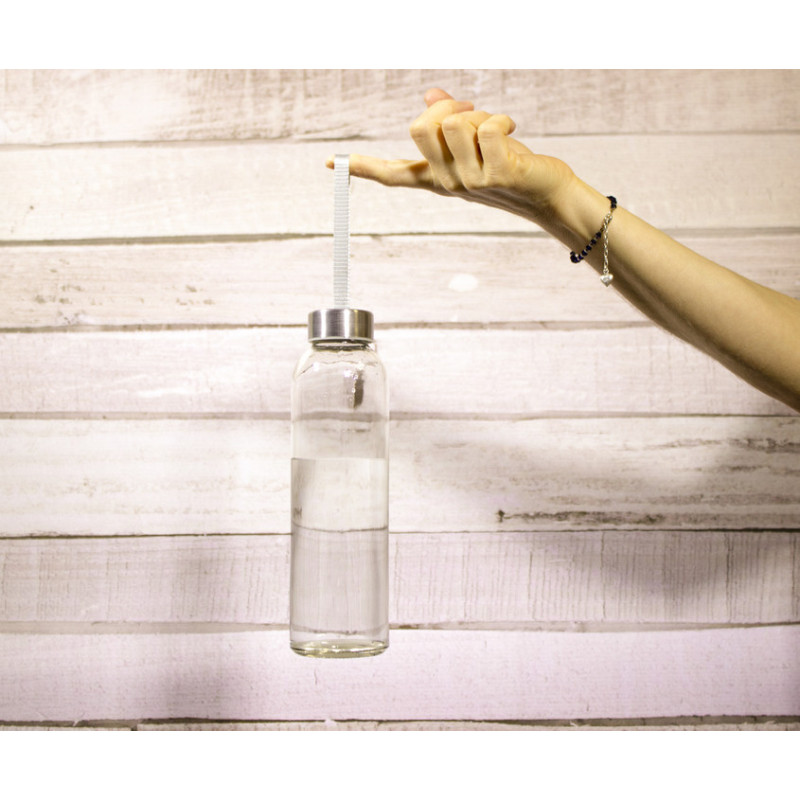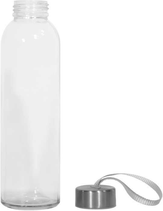 Vidrio resistente (Sodocálcico). Cuerpo traslúcido con tapa de acero inoxidable y tira color gris que permite transportarla.
