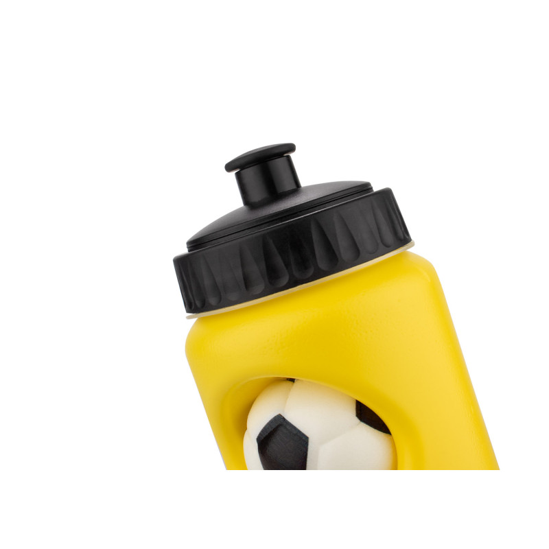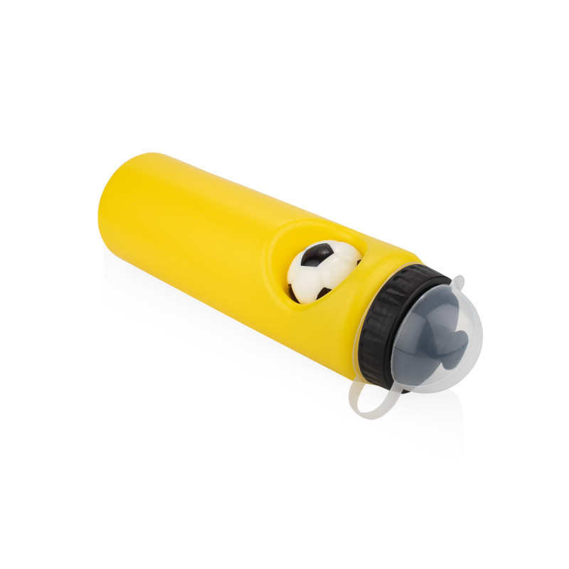 Botella deportiva de PE, ideal para actividades físicas. Su diseño incluye un antiestrés con forma de balón de fútbol (Ø 4,7), que se puede insertar y retirar del cuerpo de la botella, ofreciendo una función lúdica y relajante. Cuenta con tapa con boquilla de cierre giratorio para un consumo práctico, y un protector con asa que cubre la boquilla, manteniéndola limpia y facilitando su transporte. Capacidad: 800 ml / 27 Oz.