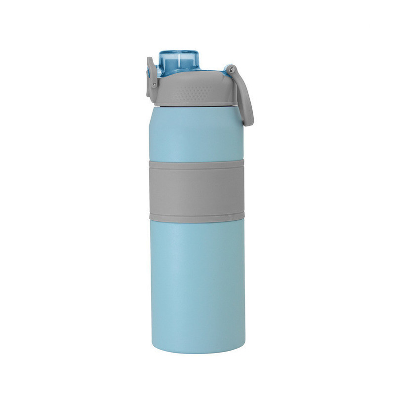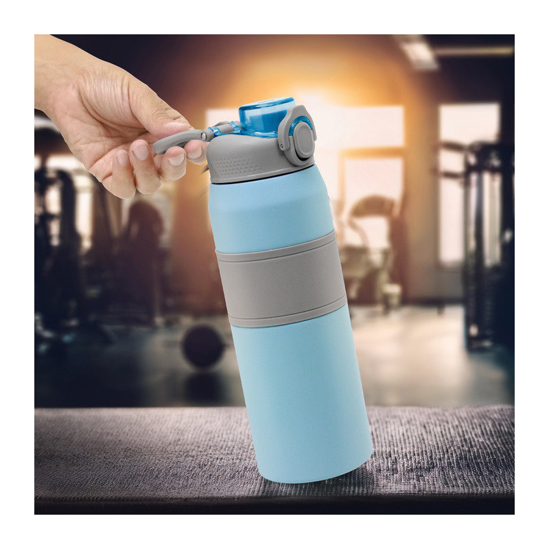 Botella deportiva con doble pared, sellada al vacío. Tecnología vacuum. Interior de acero 304 y exterior de acero 201. Pintura powder coat (pintura más duradera y resistente a la corrosión y el paso del tiempo). Tapa plástica a rosca en color gris con anillo de silicona y manija plástica para su agarre, combinada con tapa rebatible en colores translucidos a juego con el color de la botella. Boquilla con sorbete incluido. Grip de silicona color gris para mejor agarre. Mantiene alrededor de 8 hs la temperatura de las bebidas calientes y frías.