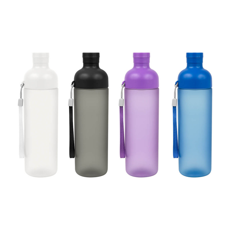 Cuenta con doble boquilla que facilita su uso para beber directamente. Ideal para actividades deportivas o de oficina. Su cuerpo con acabado frosty brinda una apariencia elegante y una textura suave al tacto, ademas de permitir visualizar el contenido interior. Incorpora una tapa superior en color solido y una correa lateral para transportarlo facilmente. Capacidad de 20 Oz.