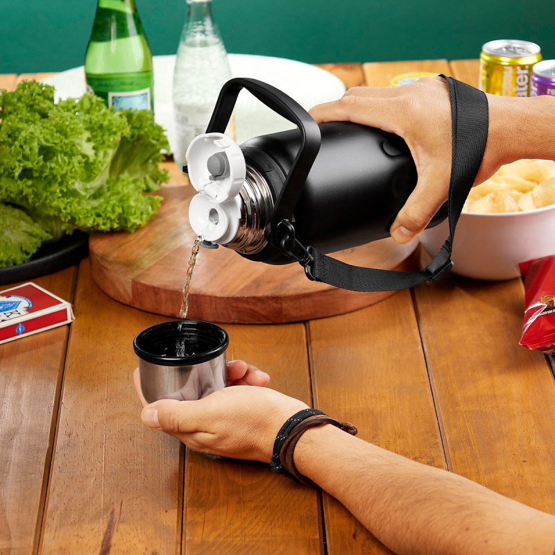 Termo doble pared. Cerrado al vacío. Pared interna y externa acero inoxidable y cuerpo con terminado tipo rugoso. Tapa de plástico con sistema de rosca, boquilla y botón de seguridad para mantener cerrado y sin derrames, incluye sobre tapa metálica de rosca. Además, agrega un asa plegable de plástico y un asa de poliéster removible, que facilita su traslado. Mantiene la temperatura caliente por 10 hrs y la temperatura fría por 12 hrs. Capacidad de 40 Oz. Incluye caja individual.