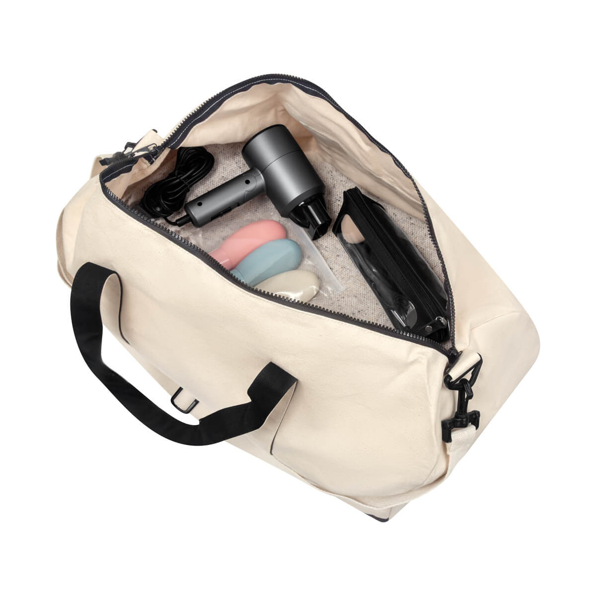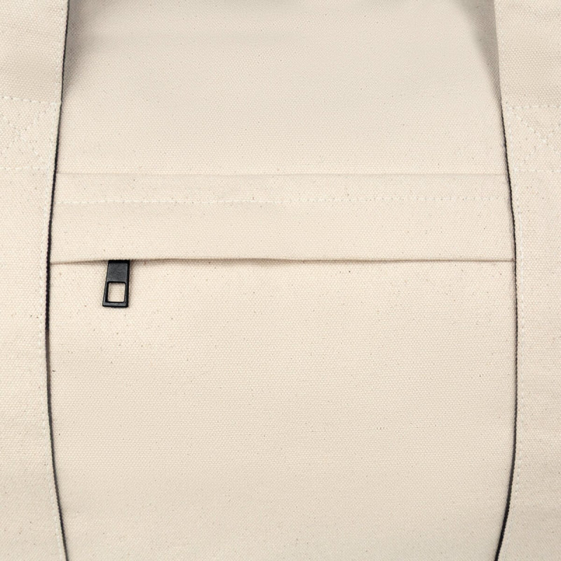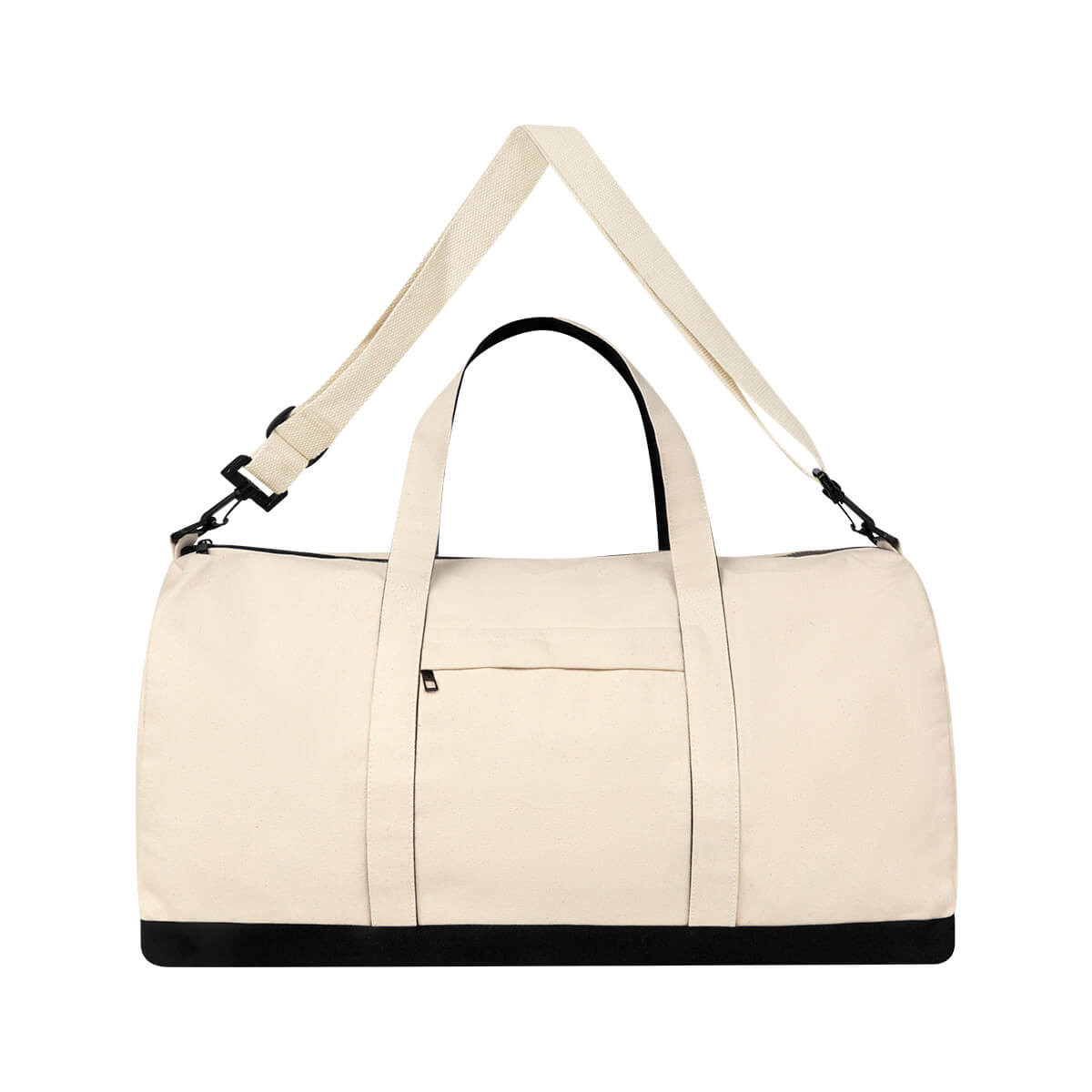 Su compartimento principal con cierre destaca por su tamano super amplio, perfecto para llevar todo lo necesario con comodidad. Incluye asas de mano para un facil agarre y una practica asa para hombro removible, sujeta con un broche de plastico para mayor seguridad. Ademas, cuenta con un bolsillo frontal con cierre que brinda acceso rapido a objetos pequenos o esenciales. Esta maleta ecologica esta fabricada con material algodon, es la companera ideal para viajes o escapadas de fin de semana.