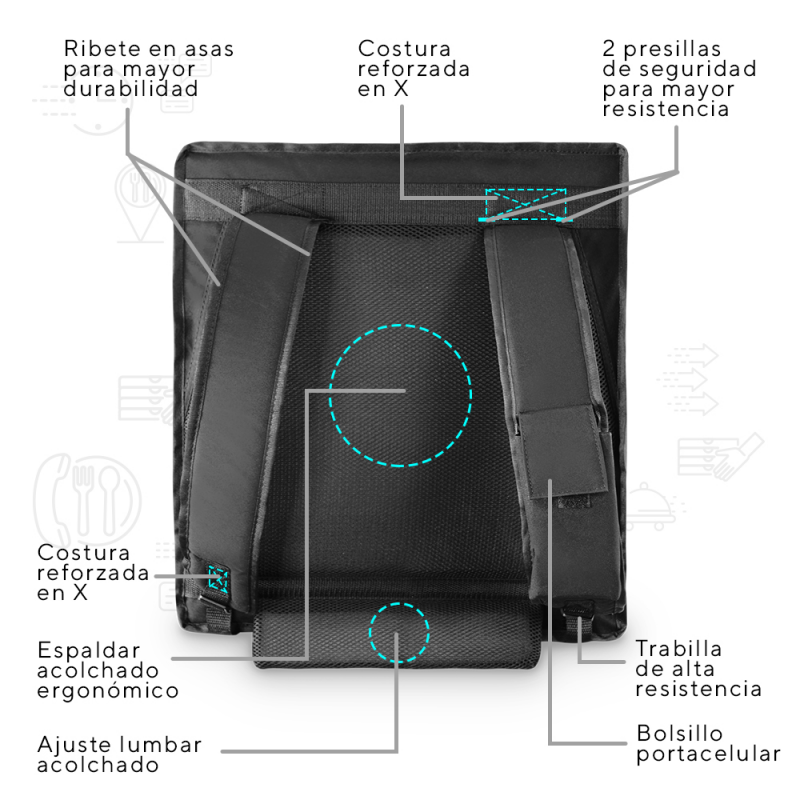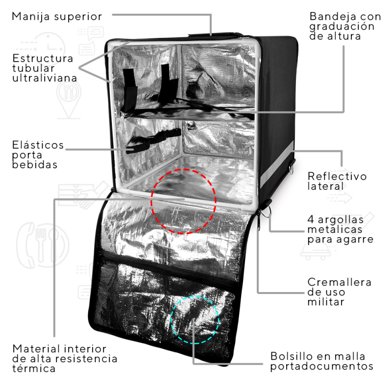 MALETA PARA DOMICILIOS QUICK • Cremalleras de alta resistencia. • argollas laterales para ajuste en bicicleta o moto. • Patas plásticas para soporte. • Reflectivo lateral y frontal certificado. • Cargaderas acolchadas. • Refuerzos en diferentes puntos para mayor resistencia. • Espaldar acolchado forrado en malla de alta resistencia. • Acolchado en la parte inferior del espaldar forrado en malla para mayor comodidad. • Bolsillo interior en malla con cierre en cremallera. • Elástico lateral porta bebidas. • Estructura interna tubular de alta resistencia. • Manija superior. • Bandeja interna con banda elástica para sujetar alimentos u objetos, y velcro lateral para ajustar altura.