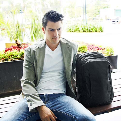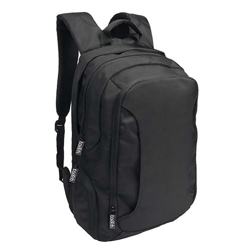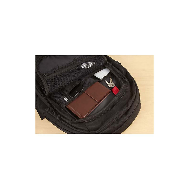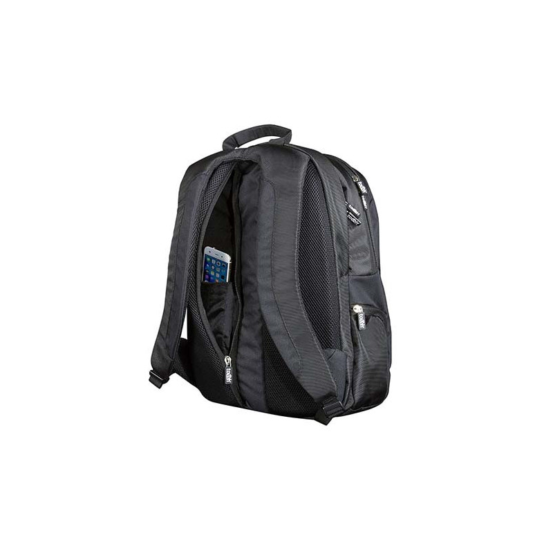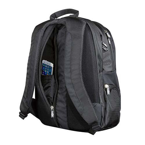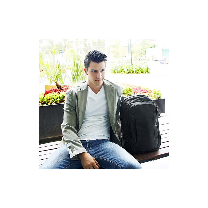 Bolsa principal con espacio para laptop. Bolsa central para tablet. Bolsa frontal con compartimentos para celular, bolígrafos y documentos. Bolsas laterales con cierre. Respaldo con cierre y porta celular interno. Respaldo y tirantes acojinados. Compartimento inferior con funda impermeable para la mochila. Incluye porta llaves.