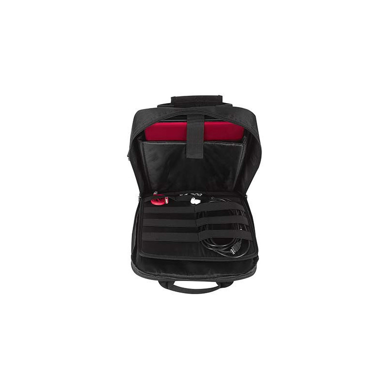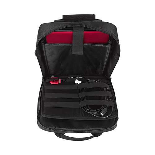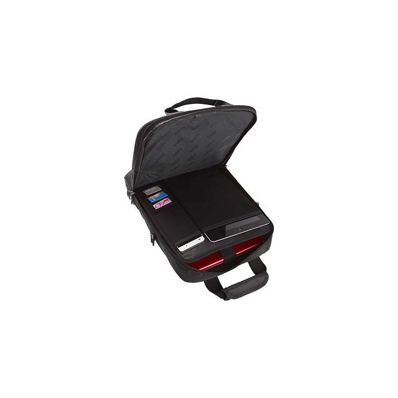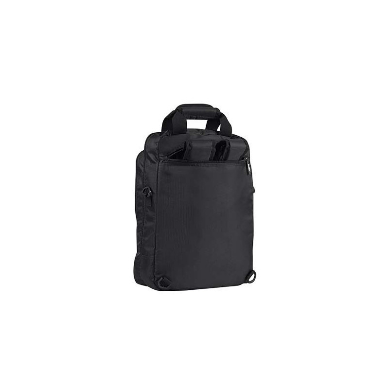 Mochila-portafolio. 2 Bolsas frontales, una con cierre en forro para facilitar bordado. Bolsa principal con espacio para laptop y organizador removible para cables, tablet, smartphone y tarjetas. Parte trasera con cierre para esconder tirantes removibles. Incluye asas y correa ajustable.