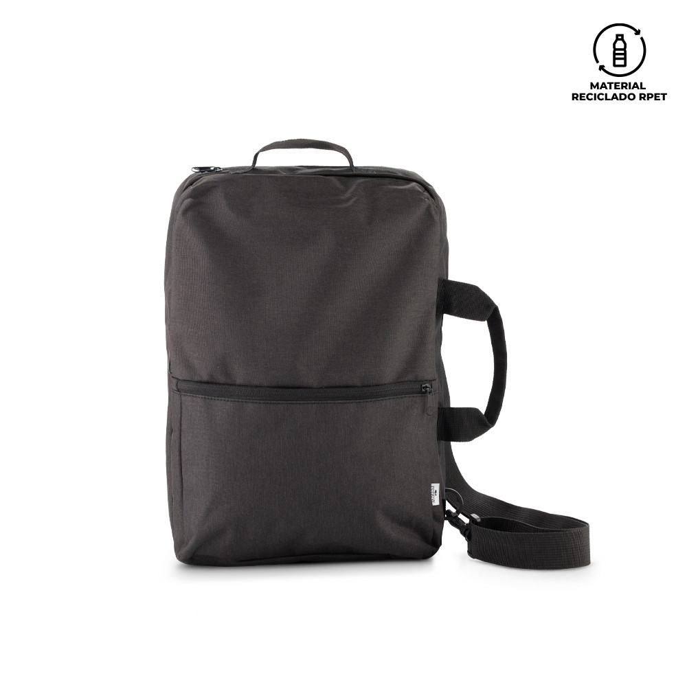 Morral backpack en poliéster RPET. Apto para portátil de hasta 15". Tres bolsillos externos con cremallera. Manija en reata para colgárselo.