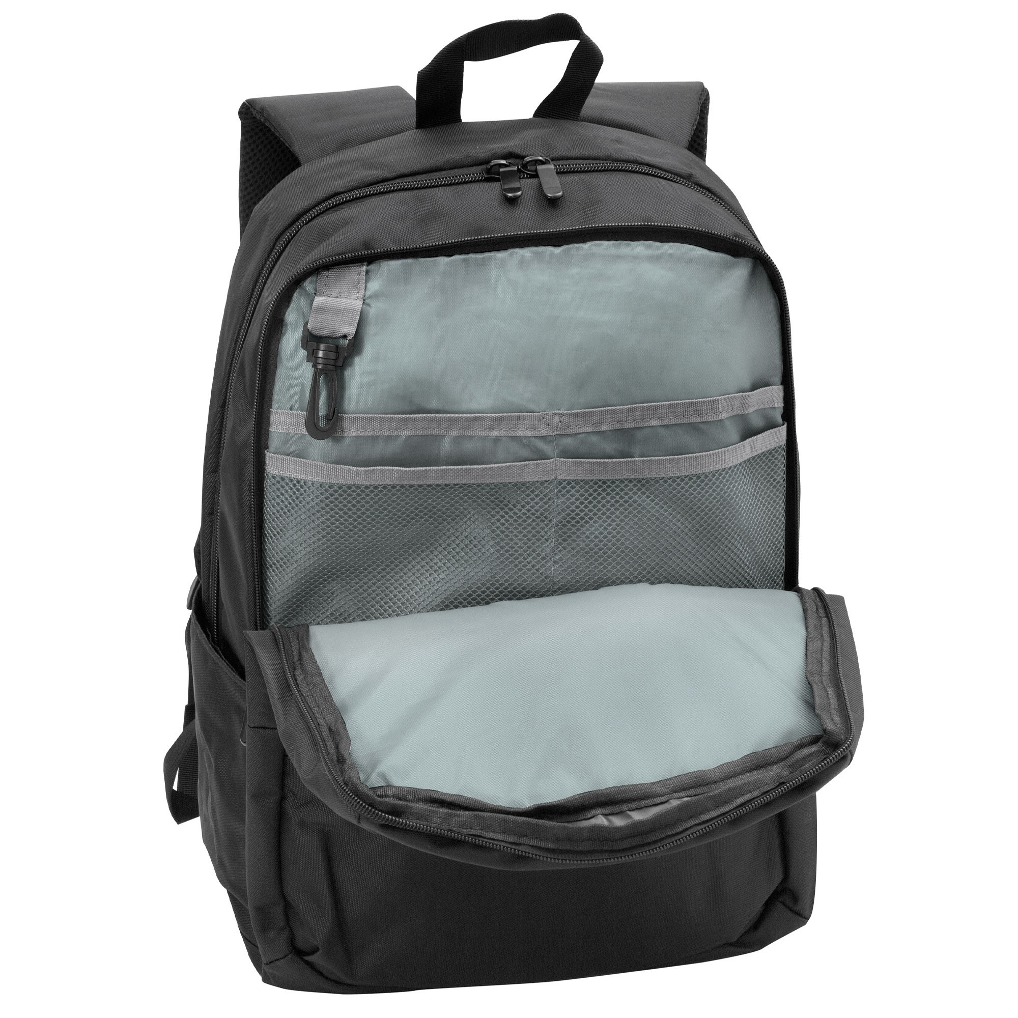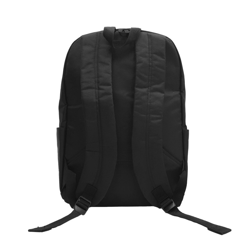 Capacidad 25 litros. Poliéster 600D. Morral Portanotebook de hasta 16". Bolsillo frontal con cierre y dos bolsillos laterales para botella o Mug. Dos compartimentos con cierre. Compartimento principal con bolsillo porta notebook y documentos. Compartimento intermedio con cuatro bolsillos pequeños y gancho plástico en su interior. Estructura, espalda y correas acolchadas. Tiradores de cierres metálicos en color negro.