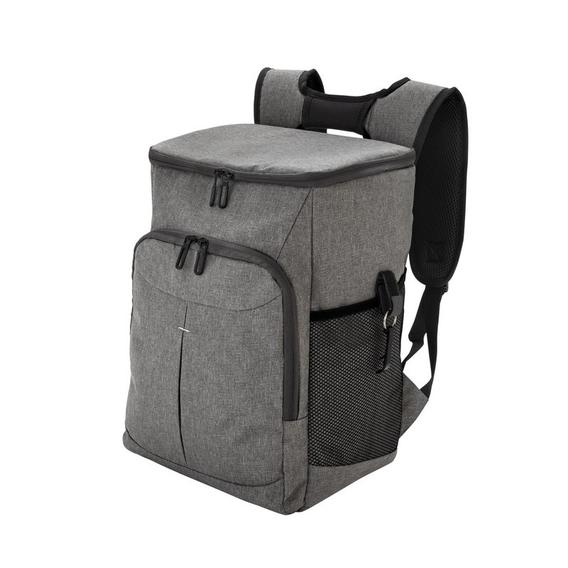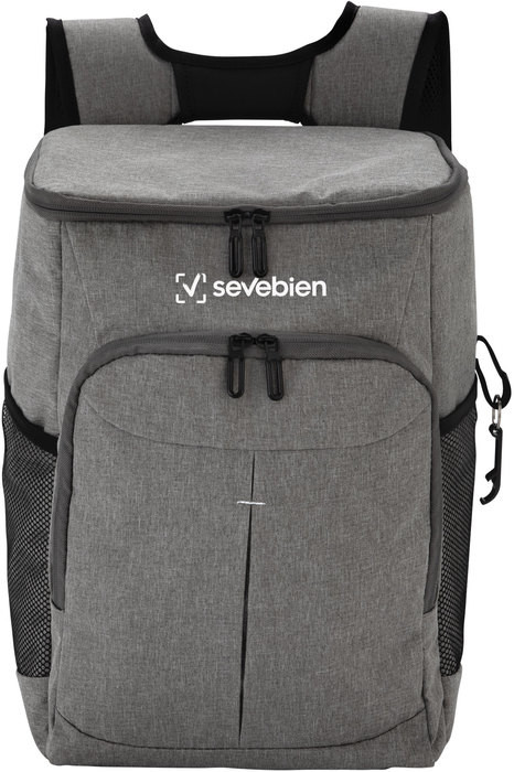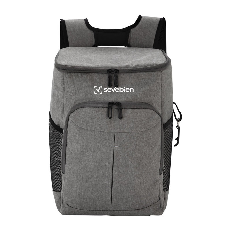 Morral cooler. Compartimento principal con cierre en la parte superior. Compartimento frontal con cierre. Dos bolsillos laterales de red multipropósito. Incluye llavero destapador de botellas de aluminio (5,5 x 1,1 cm) extraíble. Correas regulables acolchadas y reforzadas. Cierres metálicos. Tiradores de cierre metálicos de color negro.