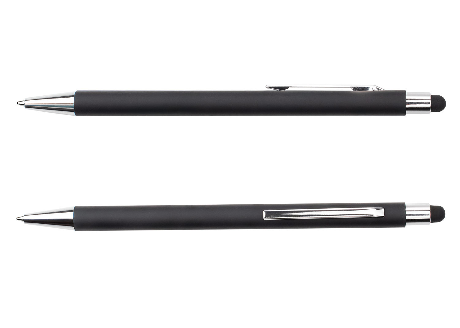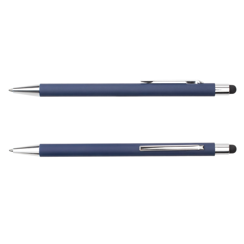 Bolígrafo retráctil con barril de aluminio engomado en color, que ofrece un agarre cómodo y elegante. Incluye clip metálico cromado y detalles en botón y punta cromados para un acabado sofisticado. Además, cuenta con función stylus en la parte superior, ideal para pantallas táctiles, combinando practicidad y estilo en un solo accesorio.