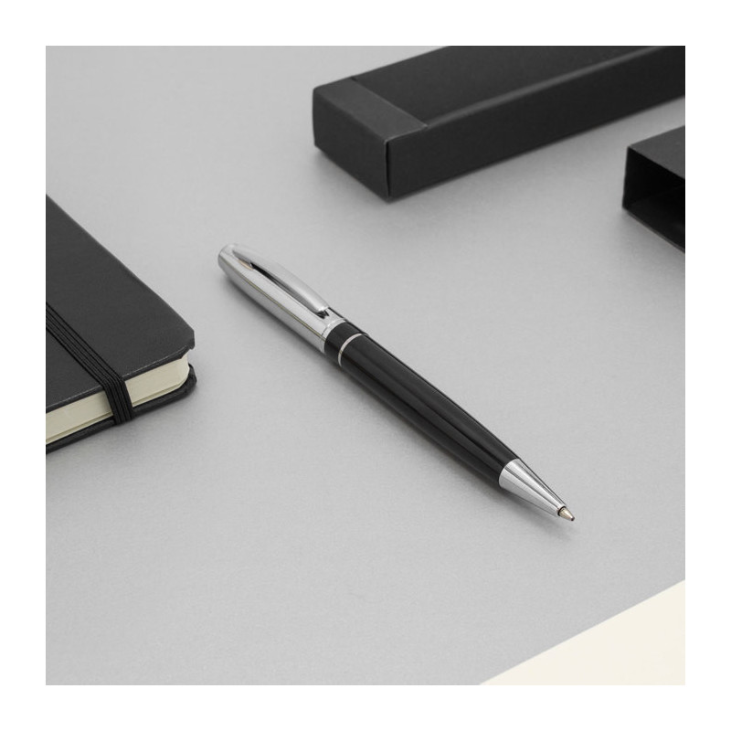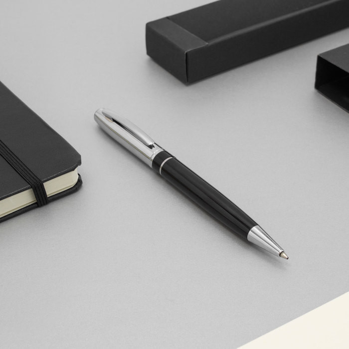 Metálico. Cuerpo color negro. Tambor superior, clip, anillo y puntera color plata. Apertura giratoria. Destape plata en la parte superior e inferior. Tinta negra. Presentación en caja de regalo.