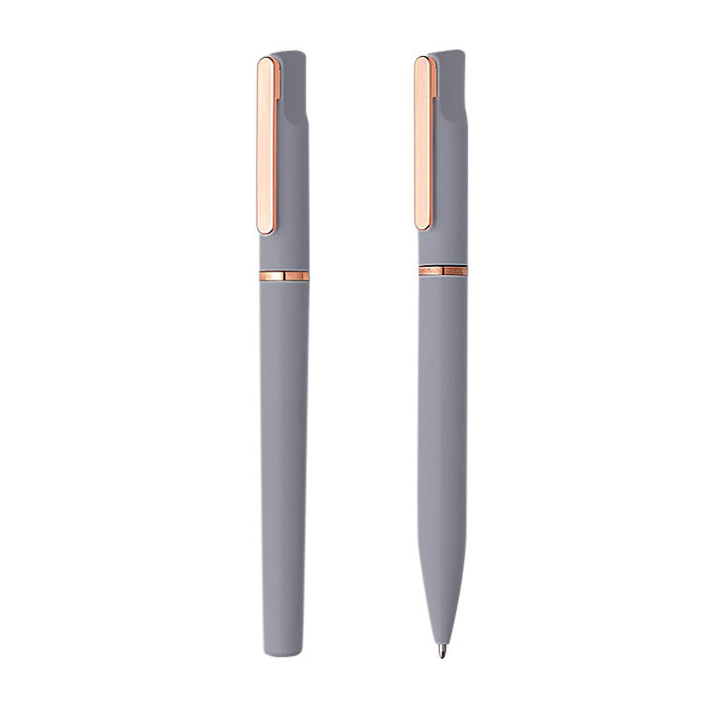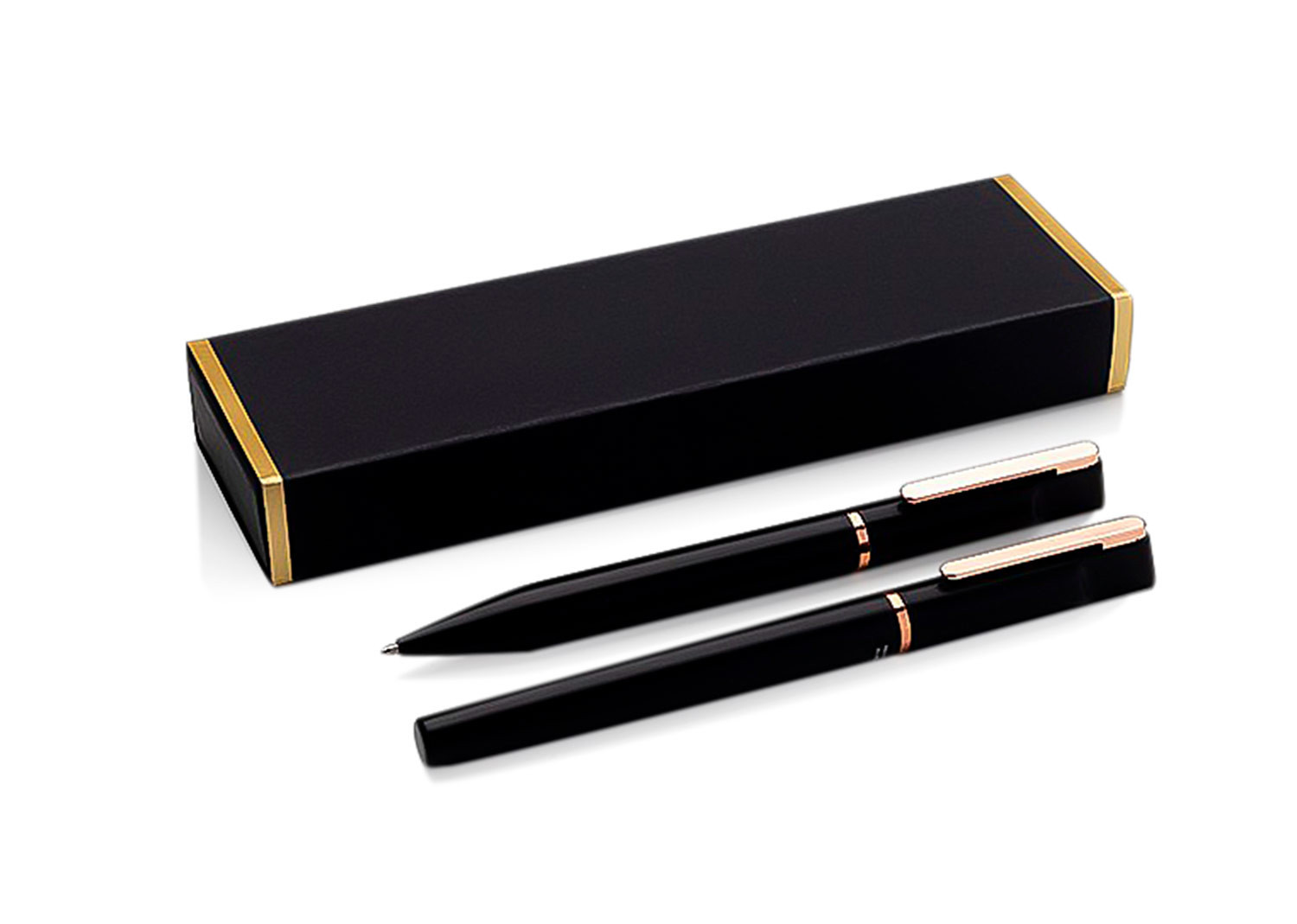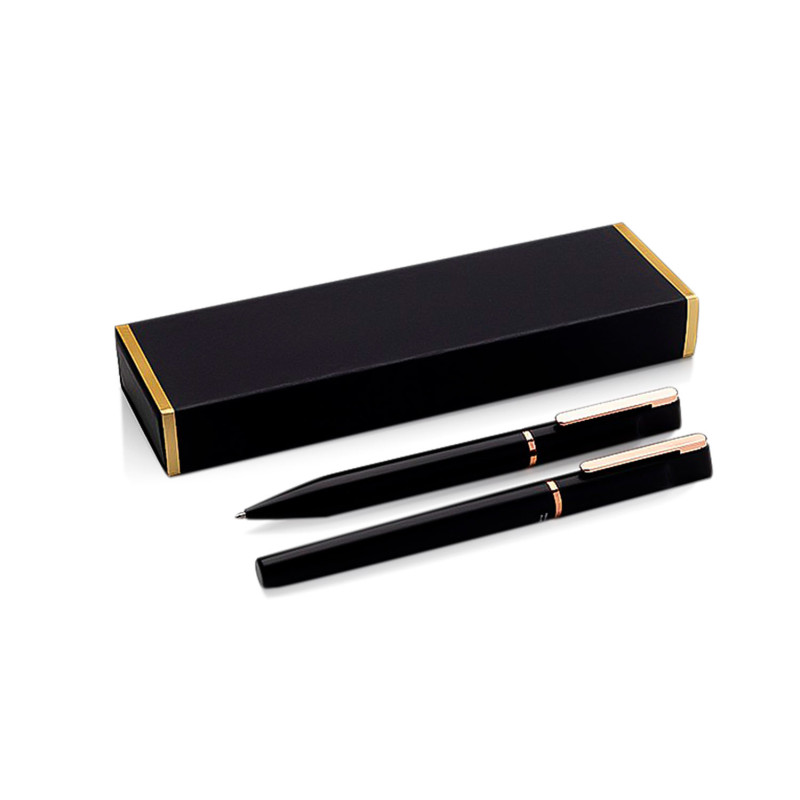 Set de escritura elaborado en aluminio reciclado, compuesto por bolígrafo con mecanismo giratorio (twist) y bolígrafo roller con tapa. Presentación en estuche rígido con detalles metálicos. Diseño elegante, funcional y de líneas clásicas.