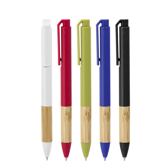 Bolígrafo retráctil. Cuerpo, puntera y pulsador de plástico reciclable. Agarre de bambú. Pintura acabado mate.