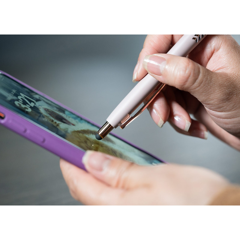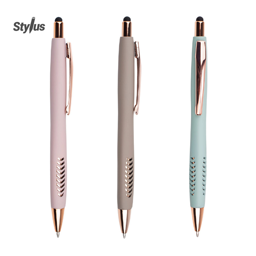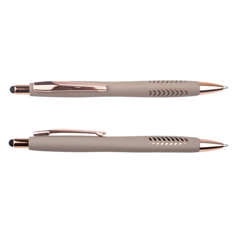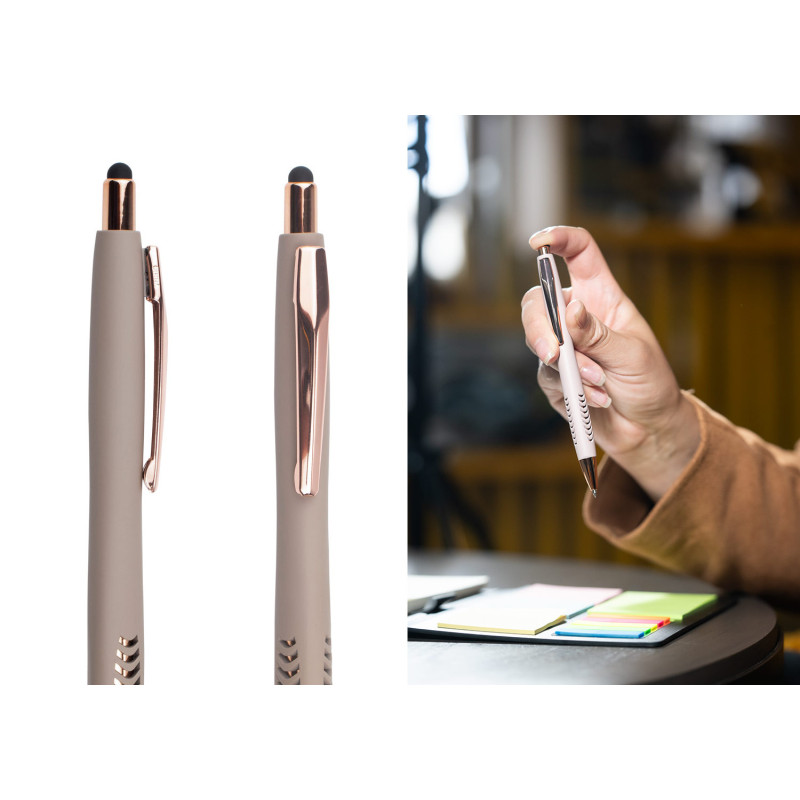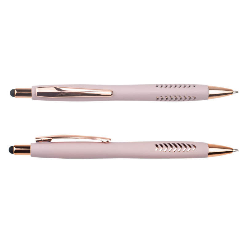 Bolígrafo con cuerpo de color sólido mate, suave al tacto, diseño sofisticado. Detalles metalizados rosa. Sistema de apertura retráctil con stylus para pantallas táctiles. En la parte inferior, contiene 2 detalles con hundimiento en forma de punta de flecha. (Bolígrafo/Esfero)
