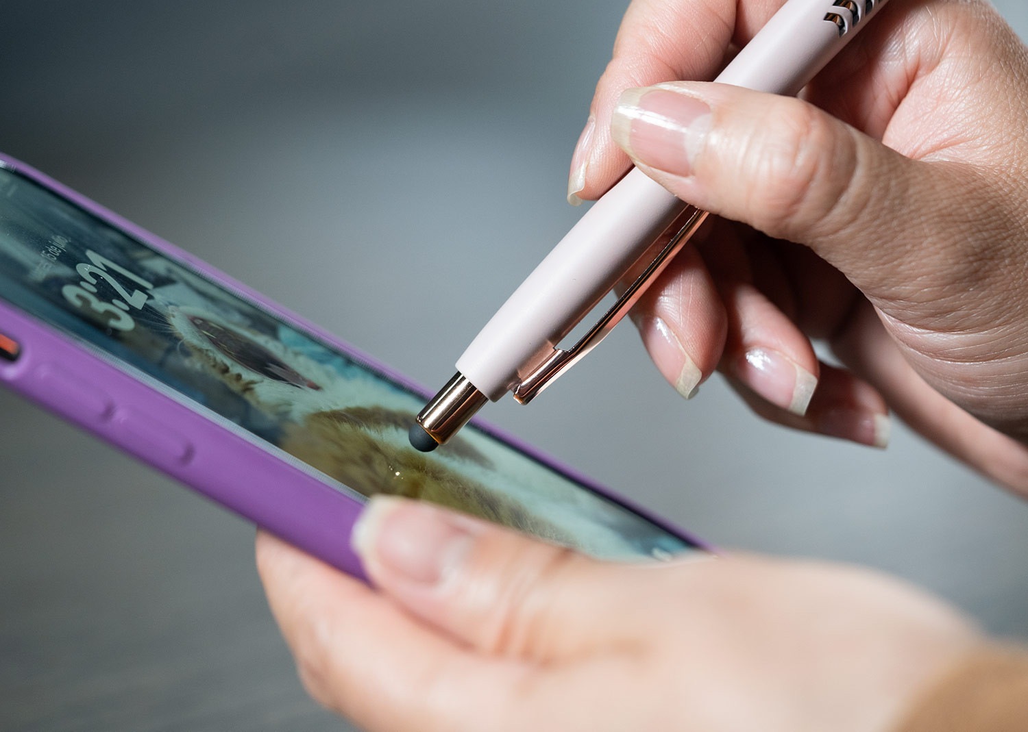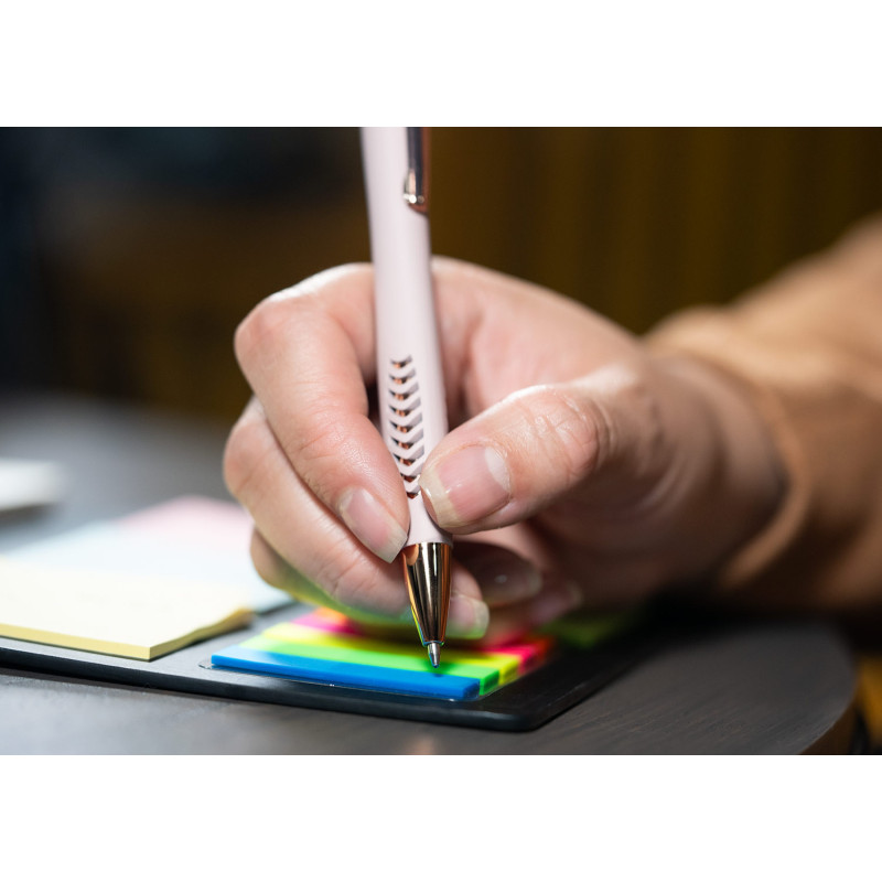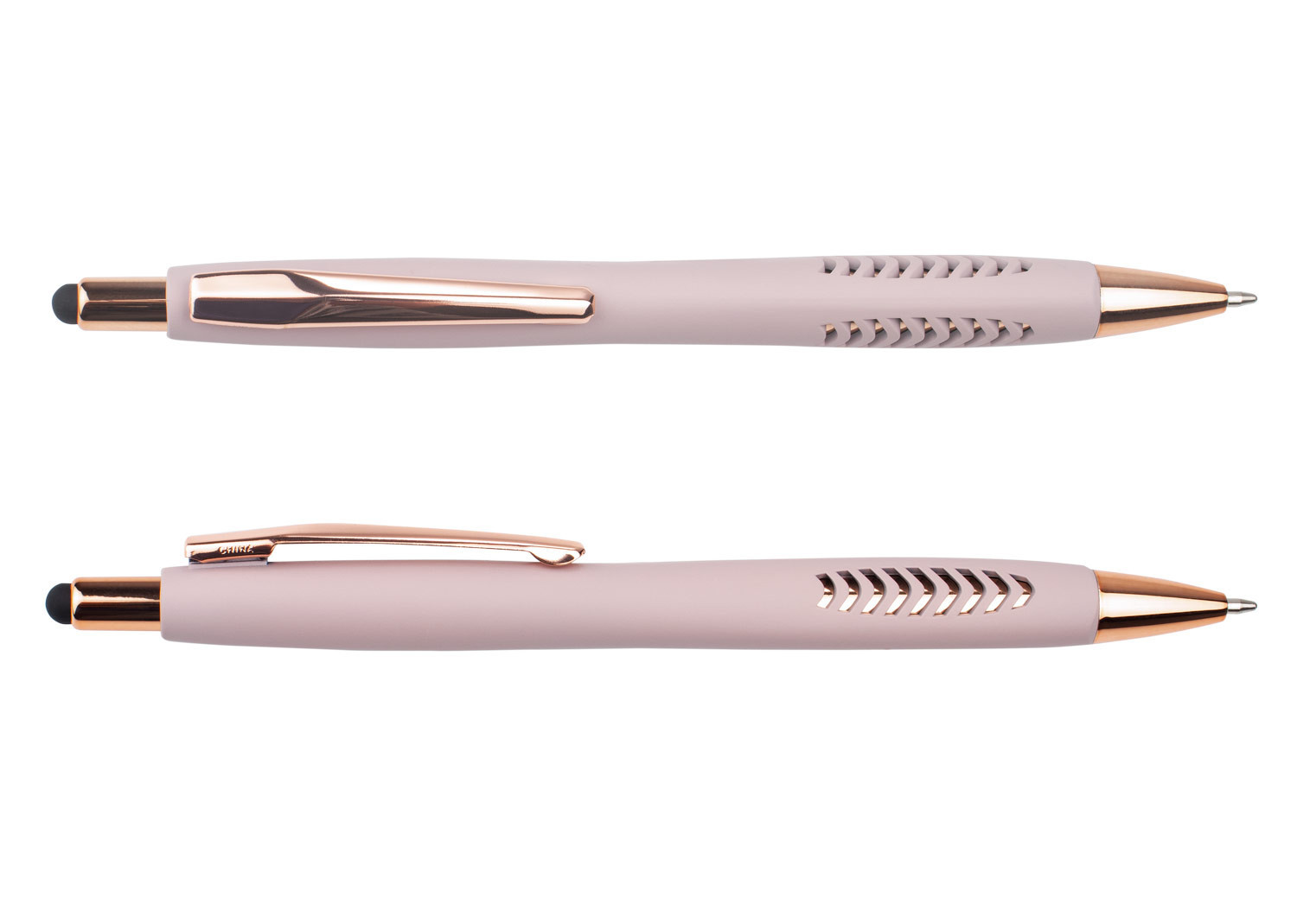 Bolígrafo con cuerpo de color sólido mate, suave al tacto, diseño sofisticado. Detalles metalizados rosa. Sistema de apertura retráctil con stylus para pantallas táctiles. En la parte inferior, contiene 2 detalles con hundimiento en forma de punta de flecha. (Bolígrafo/Esfero)