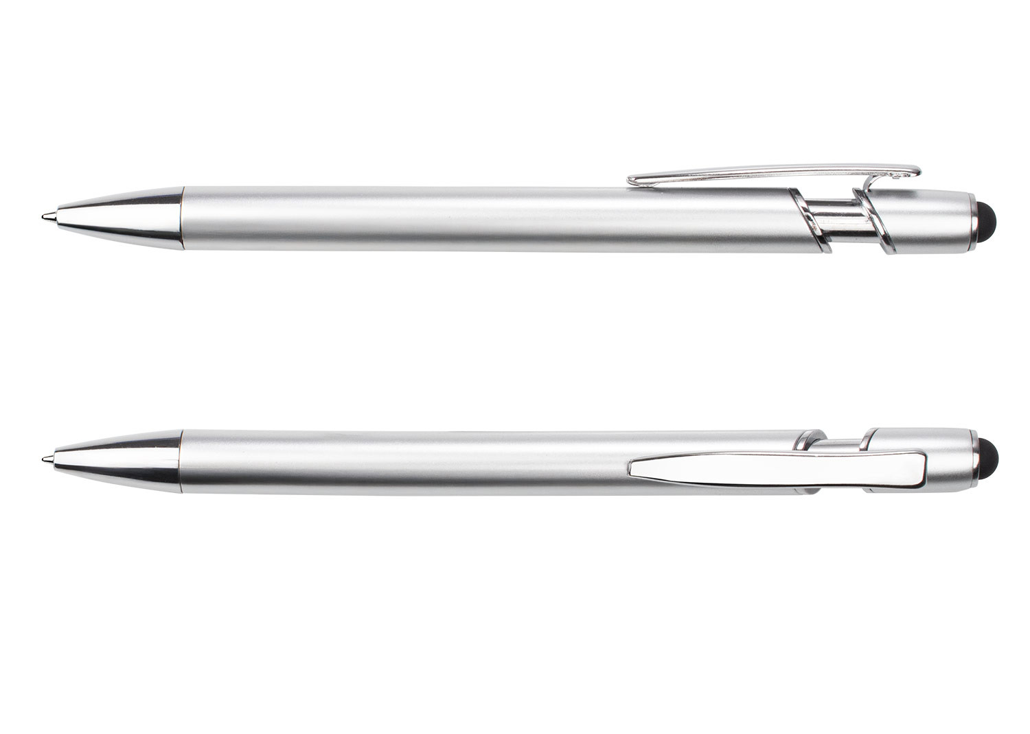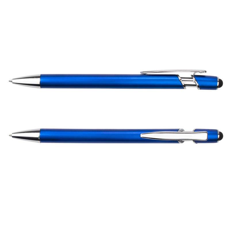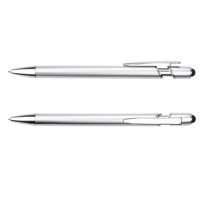Bolígrafo de diseño moderno con barril y empujador de color metálico. Incorpora clip y adornos en metal cromado, que aportan un acabado elegante. En la parte superior, cuenta con función stylus compatible con pantallas táctiles. Mecanismo retráctil para mayor comodidad y funcionalidad.