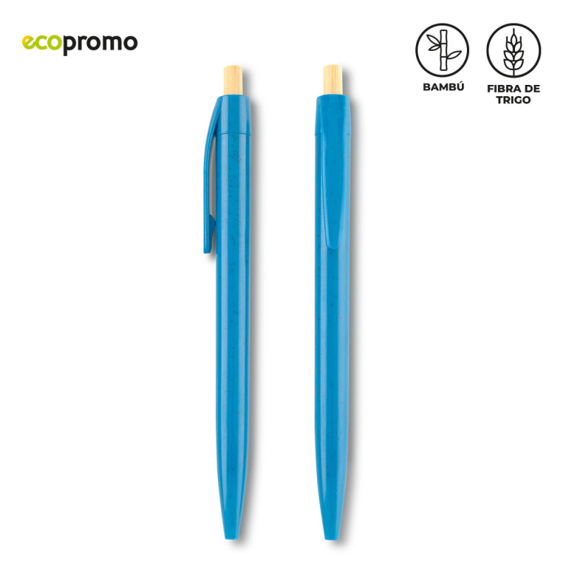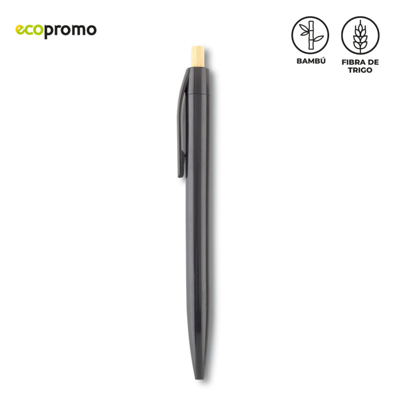 Bolígrafo plástico con mecanismo push en bambú. Mezcla con material ecológico en fibra de trigo. El porcentaje de material ecológico tiene un promedio de biodegradabilidad de 2-3 años después del fin de su vida útil.