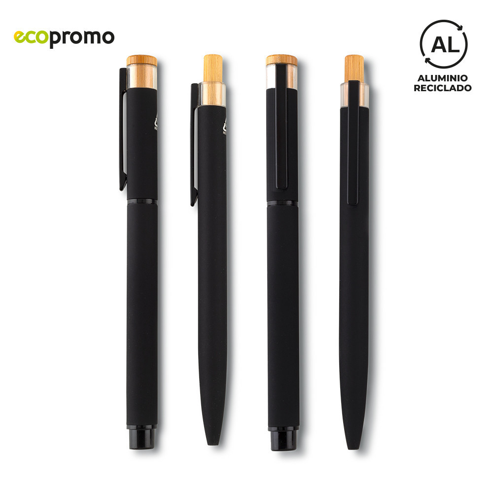 Set de bolígrafos tipo roller y de mecanismo push, en aluminio reciclado con clip metálico.