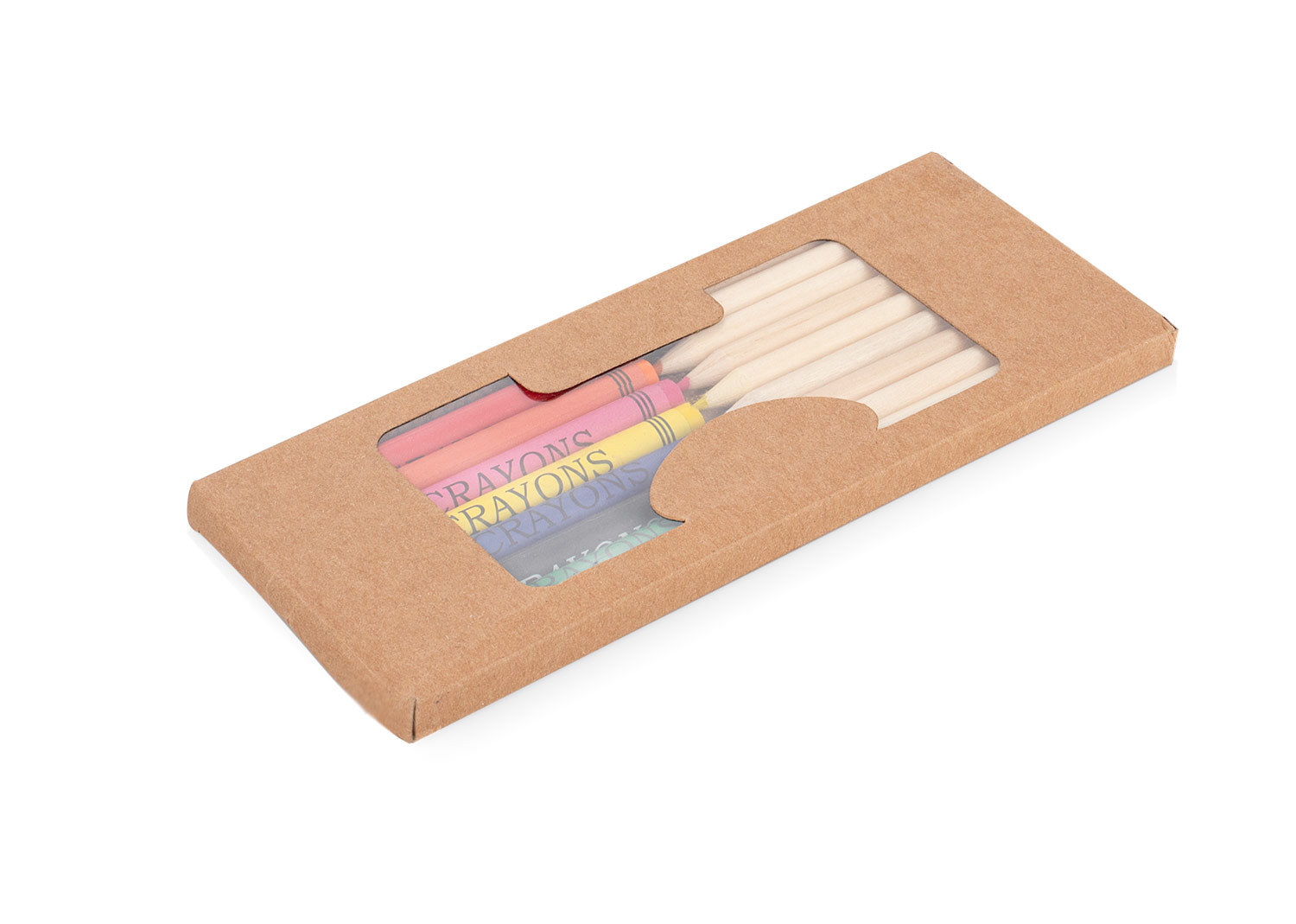 Set de 9 crayolas de color y 10 lápices de colores en estuche de cartón.
