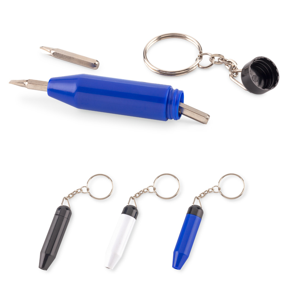 Mini set de destornilladores en estuche plástico que funciona como mango de agarre. De 3 piezas. Con llavero.