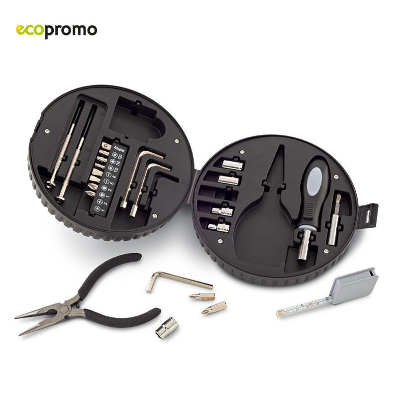 Set de herramientas de 24 piezas en estuche plástico y bambú. Cierre a presión. Empaque caja individual.