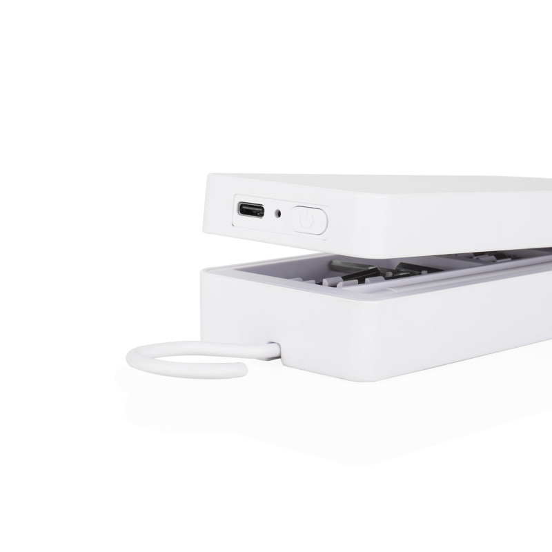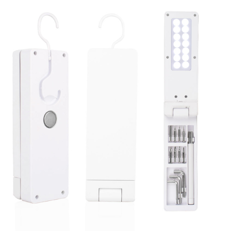 La linterna multifuncional cuenta con botón de encendido que permite ajustar la intensidad de la luz en tres niveles, apagándose al cuarto clic. Su cabezal giratorio permite orientar la luz según la necesidad, brindando mayor versatilidad en espacios de trabajo. Incorpora entrada tipo C para recarga, base magnética para sujetar piezas metálicas y gancho para colgar (3,2 X 4,5). Además, incluye 8 puntas de destornillador, sujetador de pieza (12,5 X Ø 0,7) y 3 llaves hexagonales, lo que la convierte en una solución práctica y completa para espacios de trabajo. Está fabricada en ABS, PP y hierro inoxidable.