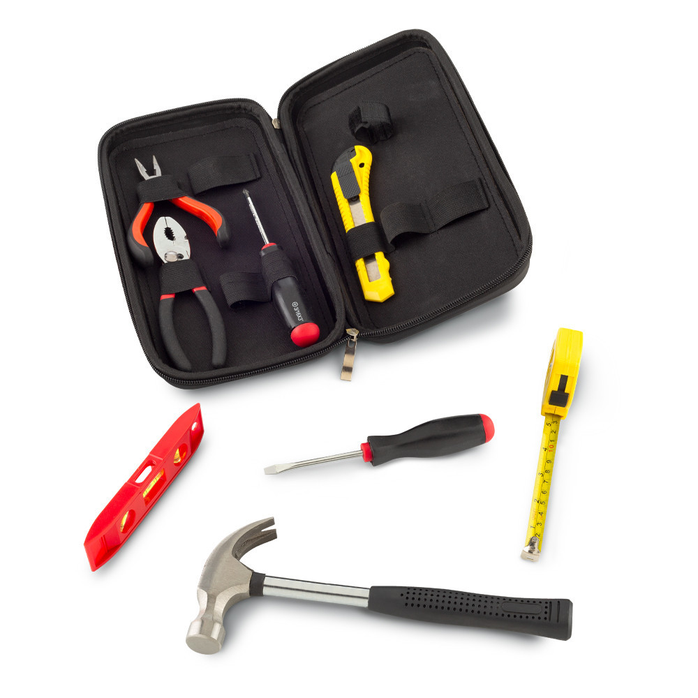 Set de herramientas de 8 piezas en estuche de goma EVA. Empaque caja individual.
