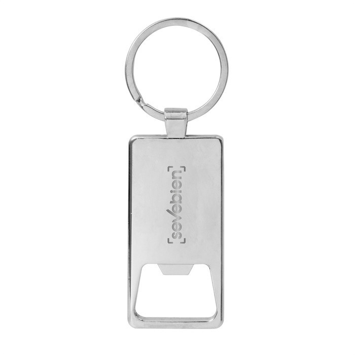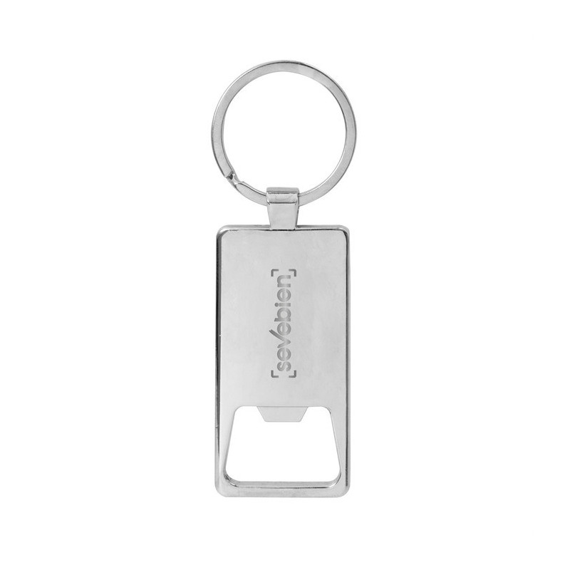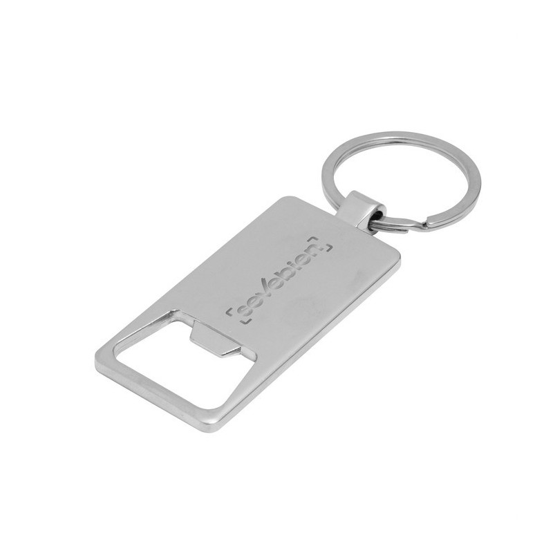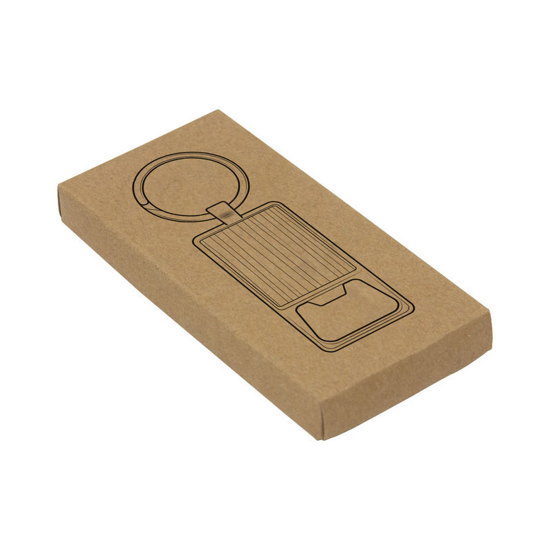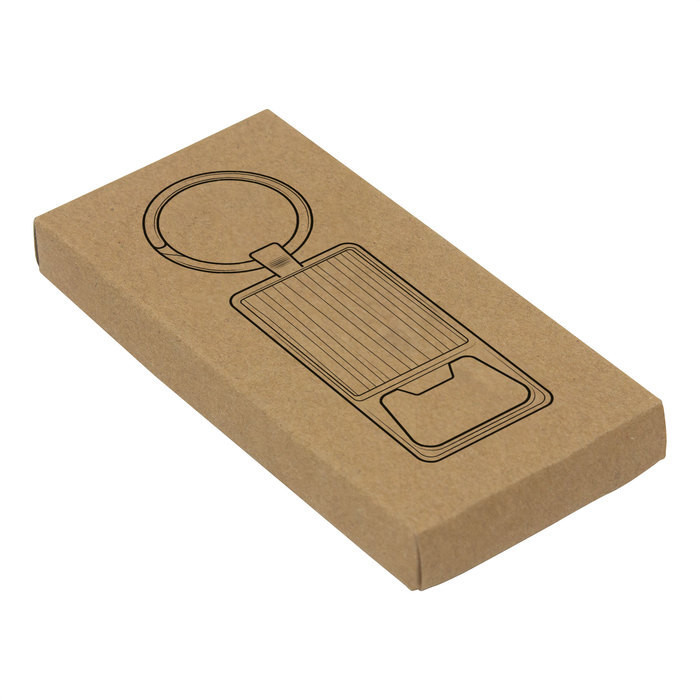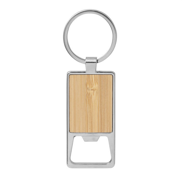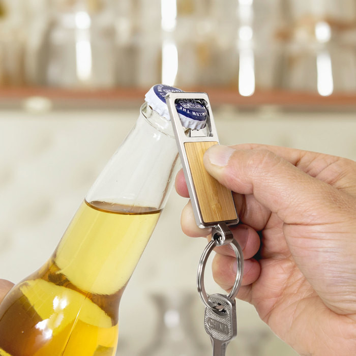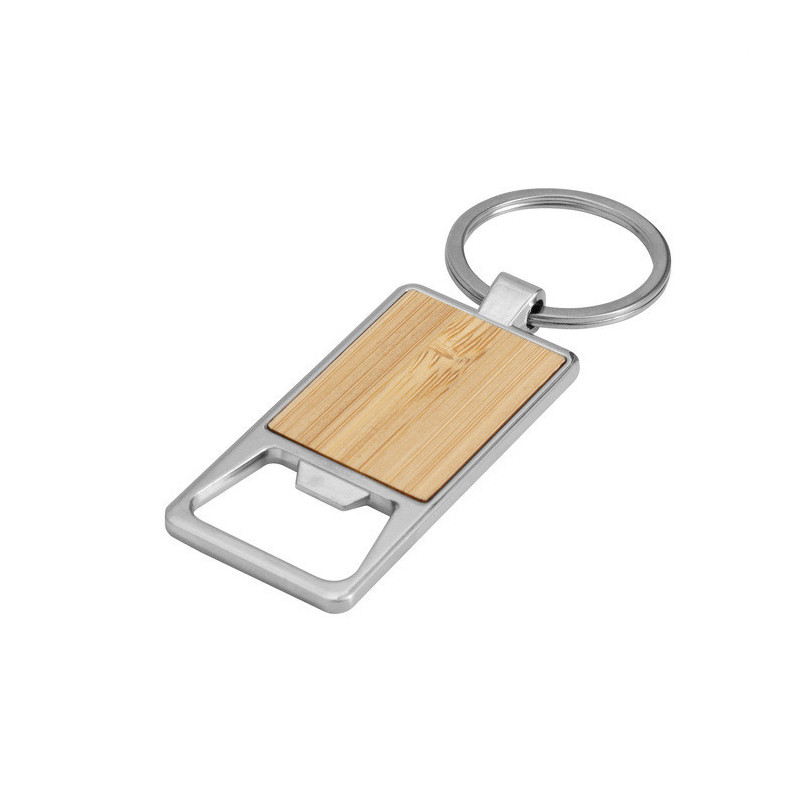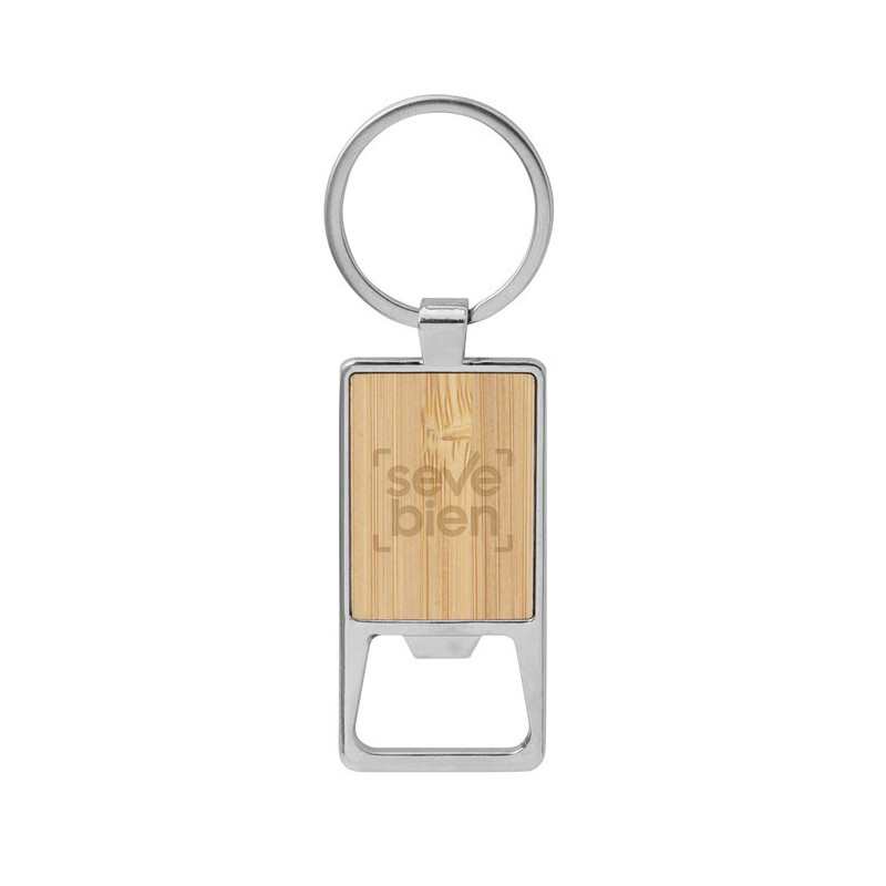 Llavero con destapador abre botellas. Estructura metálica con aleación de zinc con acabado brillante y panel frontal de bambú barnizado,Presentación: en caja de regalo kraft con bandeja de terciopelo color negro.