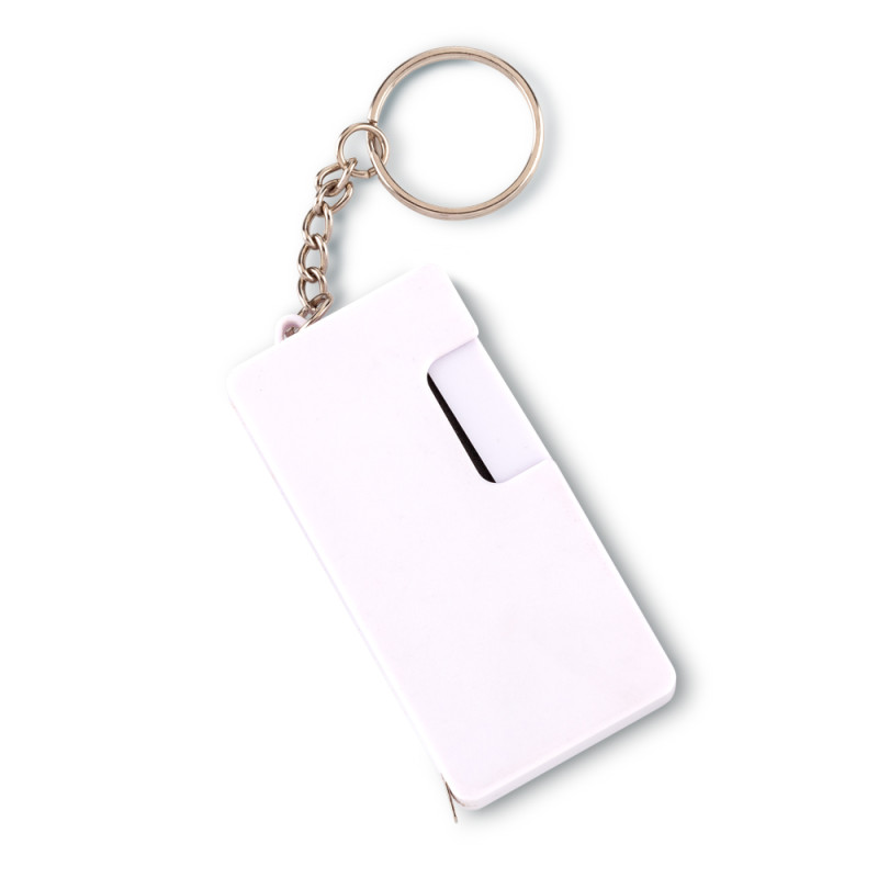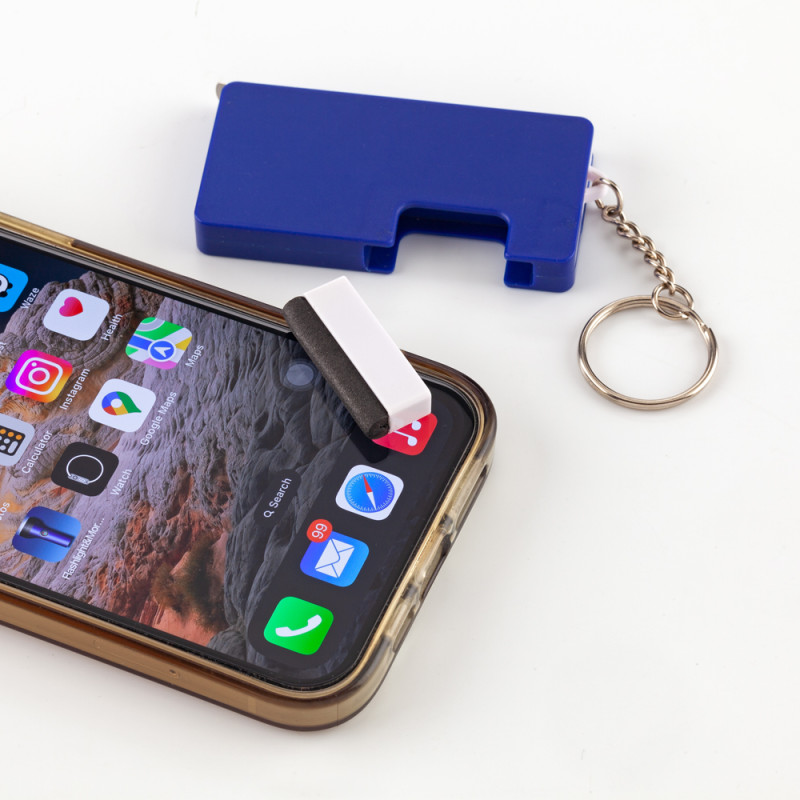 Llavero plástico con metro de 1 mt, soporte para celular y limpia pantallas.